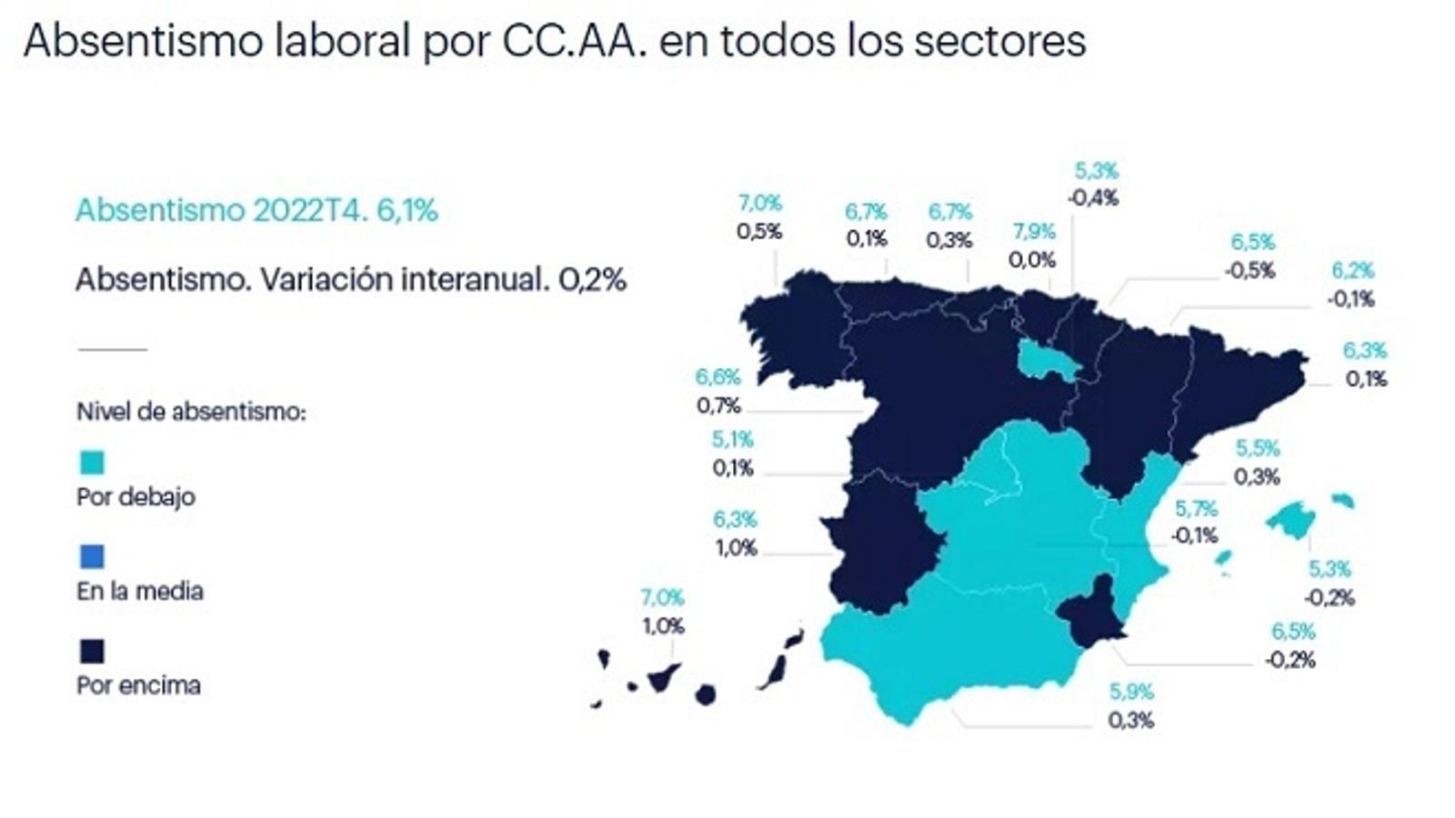 Por regiones, el País Vasco se mantiene como la comunidad con el mayor nivel de absentismo (7,9%) seguido de Canarias (7%) y Galicia (7%). Por el contrario, los niveles más bajos se localizan en Baleares (5,3%), La Rioja (5,3%) y Madrid (5,1%).