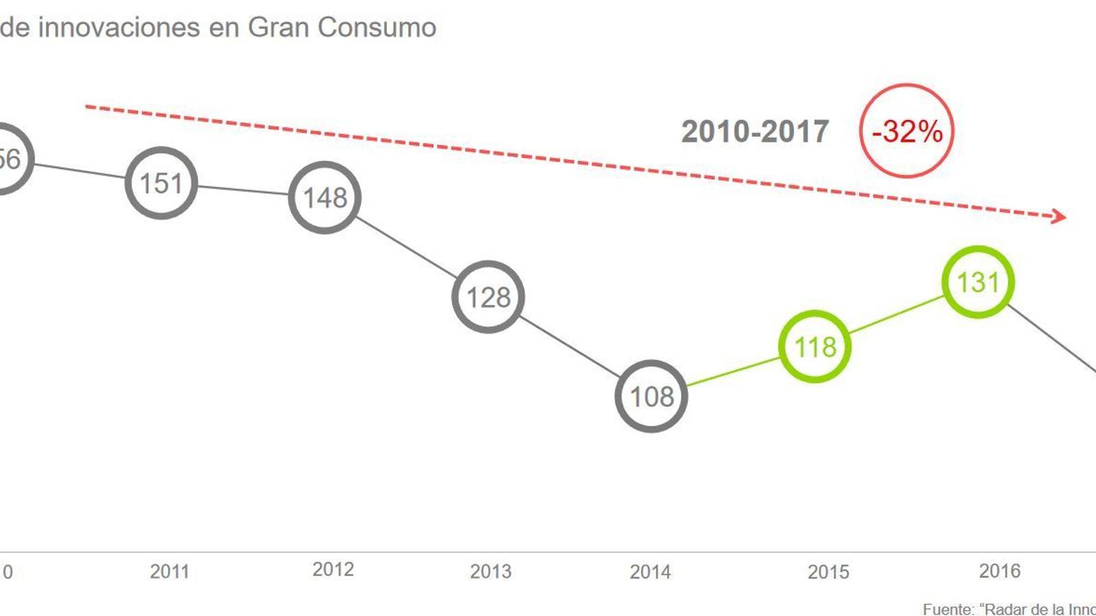 La innovación en el gran consumo español presentó en 2017 un dato de lo más negativo, según se desprende del último informe Radar de la Innovación, presentado por Kantar WorldPanel. "Situación muy preocupante", apunta Promarca en su análisis, después de conocerse que el número de innovaciones reales en el sector llegó apenas a las 106 el año pasado, que supone un descenso del 19% respecto a 2016. Son mínimos históricos. "Alarma roja", añade el lobby de las marcas de fabricante, que ha subido el tono de su ataque contra Mercadona y Lidl, consideradas las grandes culpables de este descenso de la innovación.