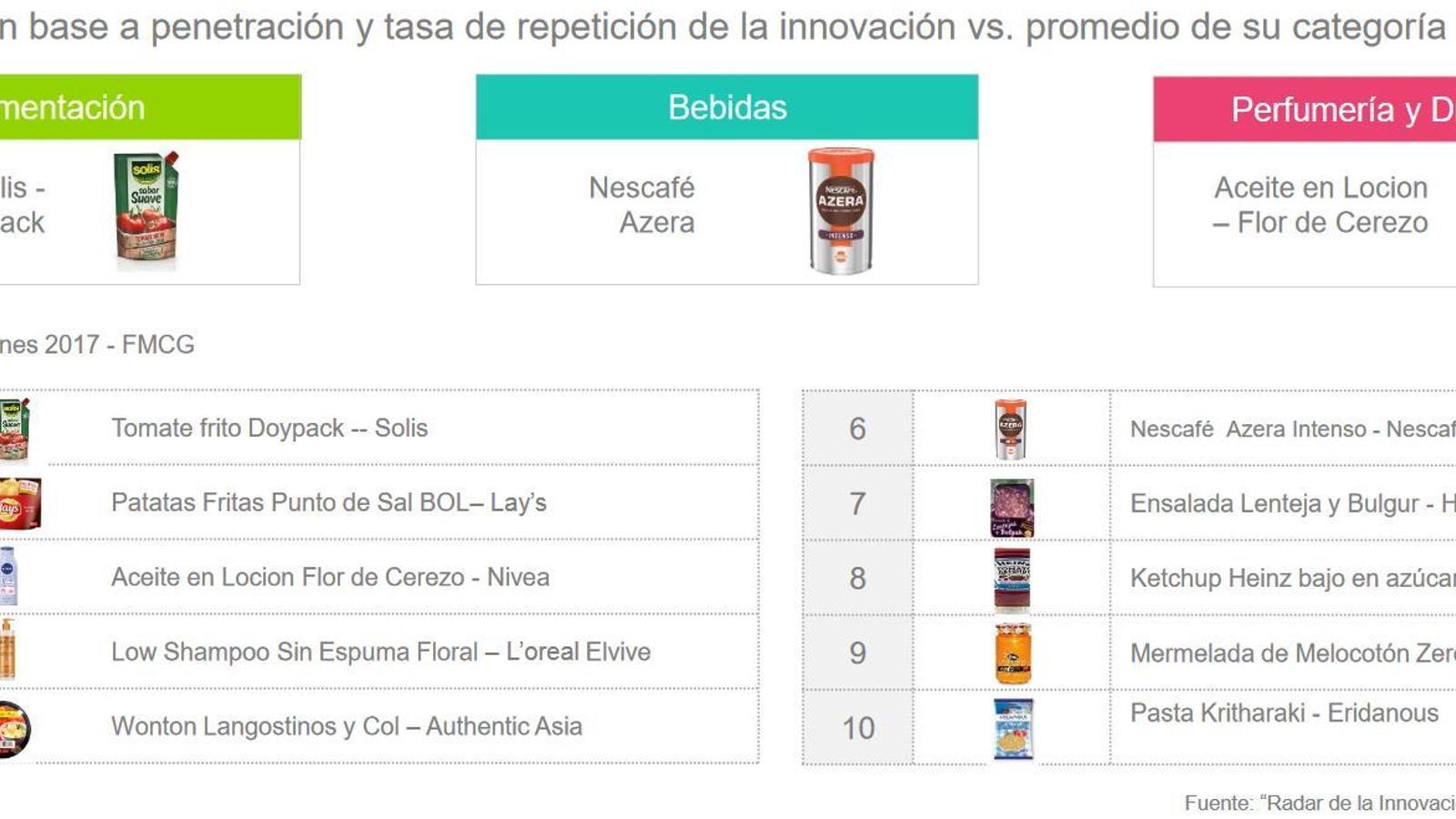 El Top 5 de las innovaciones más exitosas de 2017 lo conforman el mencionado tomate frito Doypack de Solís, las Patatas Fritas Punto de Sal BOL de Lay's, el Aceite de Loción Flor de Cerezo de Nivea, el Low Shampoo Sin Espuma Floral de L'Oréal Elvive y el Wonton Langostinos y Col de Authentic Asia.