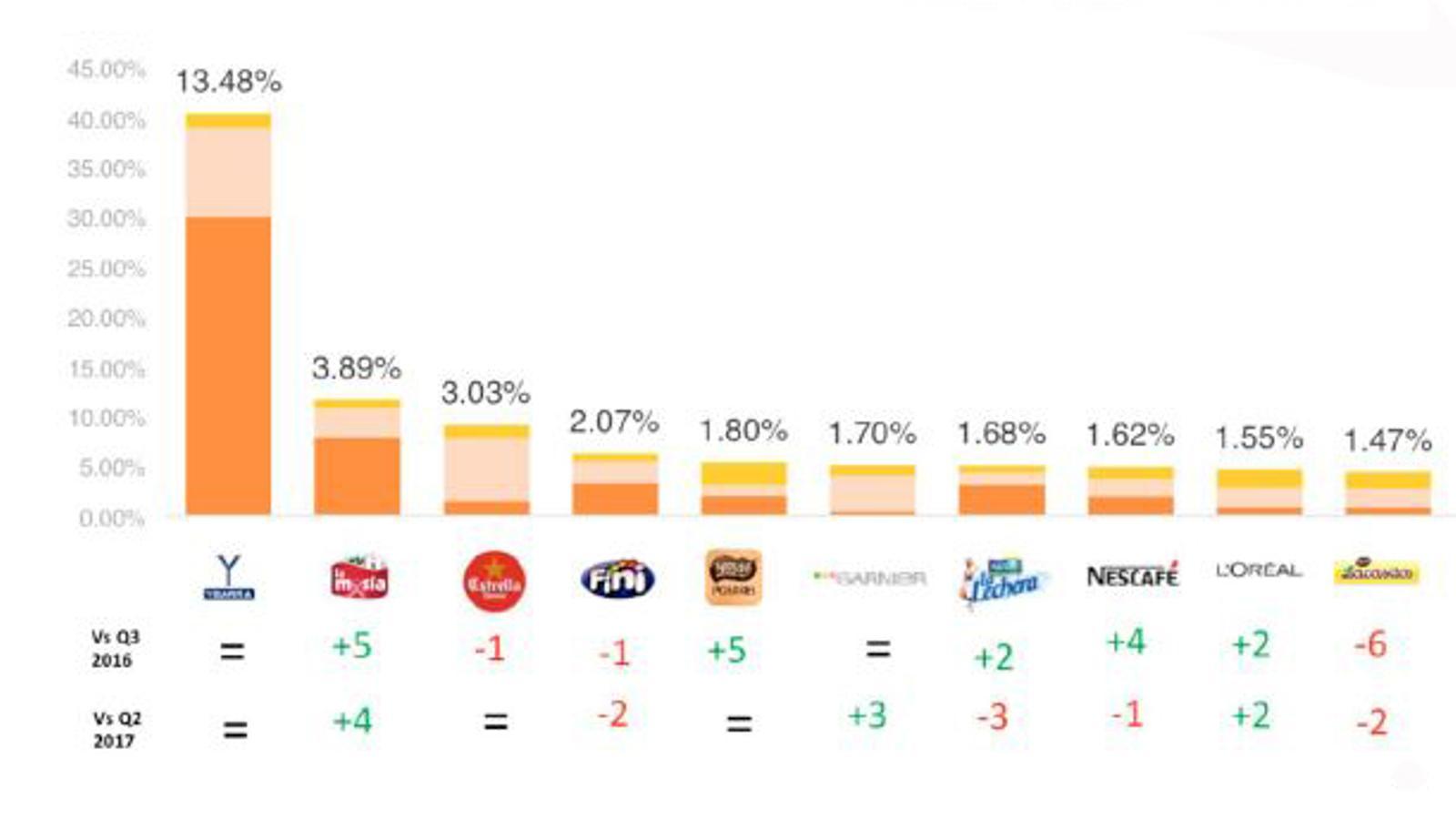 Por marcas, las diez marcas que mejor lo están haciendo en redes sociales son Ybarra, La Masía, Estrella Damm, Fini Golosinas, Nestlé, Garnier, La Lechera, Nescafé, L'Oréal y Lacasitos.