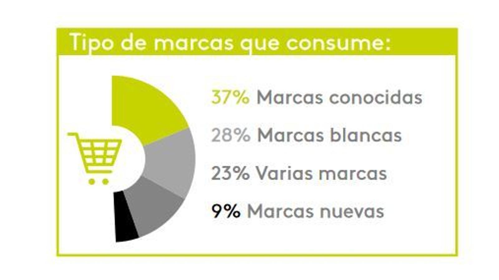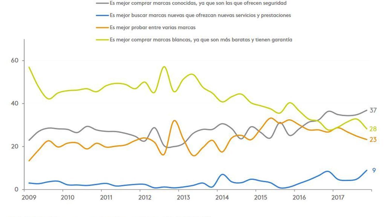 Finalmente, se observa una tendencia regresiva en la preferencia por las marcas de distribución, que habían llegado a ser muy mayoritarias. En el último trimestre de 2017 un 28% muestra su preferencia por la marca blanca, un 14% menos ue en el trimestre anterior y un 30% menos que en el último periodo de 2015, cuando la cifra alcanzaba el 40% de los españoles.