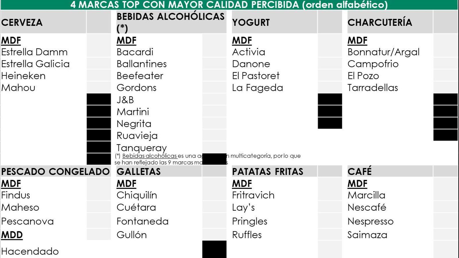 Según este análisis, incluso el 83% de los compradores habituales de marcas de distribuidor (MDD) otorgan un Índice de Preferencia por Calidad sensiblemente más alto a las MDF, ya que en todas y cada una de las categorías analizadas, al menos el 70% de estos consumidores atribuyen mayor calidad a las grandes marcas. Estas son las marcas que han obtenido los principales resultados: