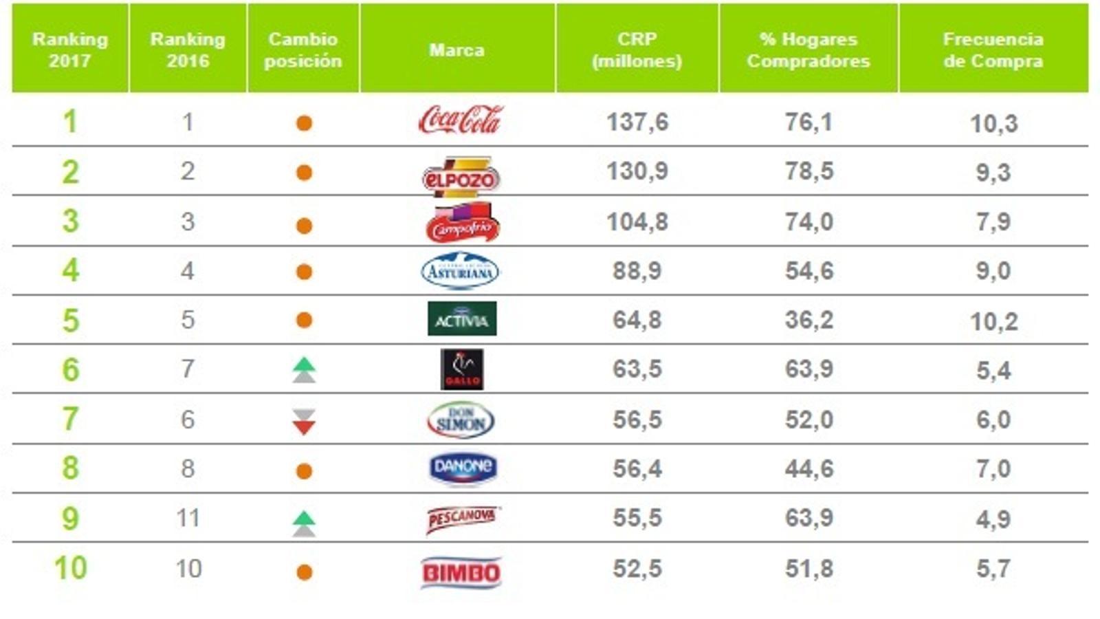Completan el Top 10 Central Lechera Asturiana, Activia, Gallo, Don Simón, Danone, Pescanova y Bimbo. En estos primeros puestos destaca el avance de una posición de Gallo a costa de Don Simón y la entrada de Pescanova al puesto nueve, tras subir del once. Esta subida ha provocado la pérdida de puestos de Puleva, que se queda en la posición 12.