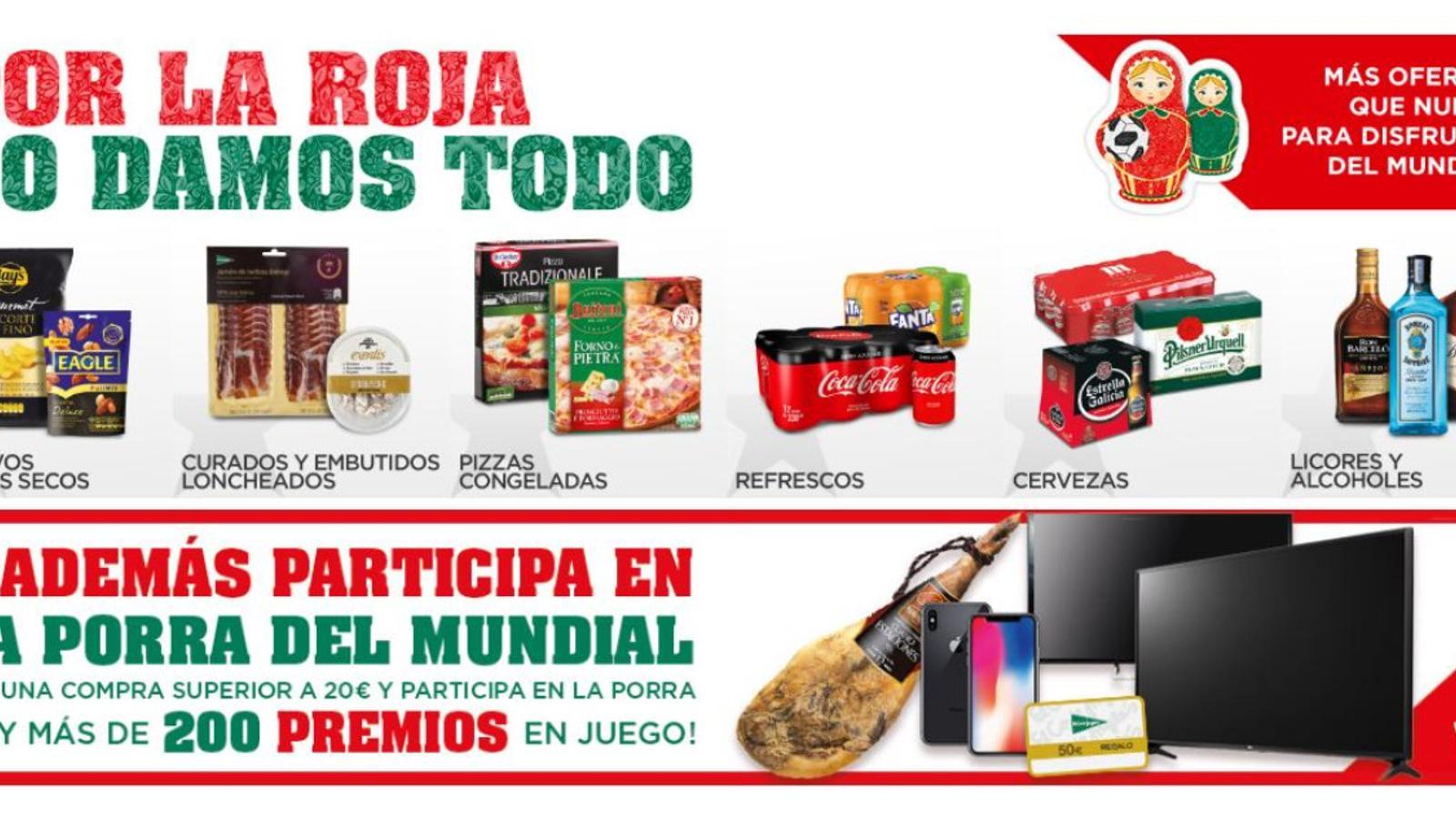Por su parte, las cadenas de distribución también se han apuntado a esta fiesta del fútbol con sus propias propuestas. Es el caso de El Corte Inglés, que ha organizado una 'porra' a la que se accede por compras superiores a 20 euros y en la que hay más de 200 euros en juego. "Por la Roja lo damos todo", dice la promoción del gigante español de la distribución que, además, lanza ofertas en variedad de productos como aperitivos, curados y embutidos, pizzas congeladas, refrescos, cervezas, licores y alcoholes para disfrutar del Mundial.