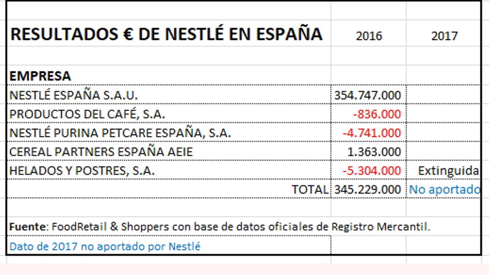 Todas las empresas de Nestlé en España, excepto Nestlé Purina PetCare España S.A., presentan una tendencia a la baja en el trienio 2014-2016. Así, Nestlé España S.A.U. pasó de vender 2.009 millones de euros en 2014 a casi 1.954 en 2016. Mientras, Productos del Café S.A. cayó de 83 millones a 77, y Cereal Partners España AEIE bajó de 55 a algo más de 42. Nestlé Purina PetCare es la única que se salva en evolución de ventas: en dicho trienio pasó de 102 a 112 millones de euros. La vendida Helados y Postres S.A. justificó año tras año la desinversión final: si en 2014 vendió 97 millones; en 2015, 92 y, en 2016, 82.