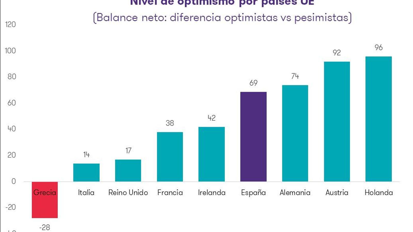 Este análisis hace hincapié en que, tras la caída de 27 puntos en los niveles de confianza experimentada en el último semestre de 2017, por la incertidumbre derivada de las tensiones territoriales y políticas en España, el primer semestre de 2018 ha visto cómo el optimismo volvía a las empresas y se recuperaba de forma igualmente rápida, pasando del 43% registrado a finales del año pasado al 69%. De esta forma, los empresarios españoles se sitúan entre los más optimistas de la zona Euro, solo por detrás de holandeses, austriacos y alemanes.