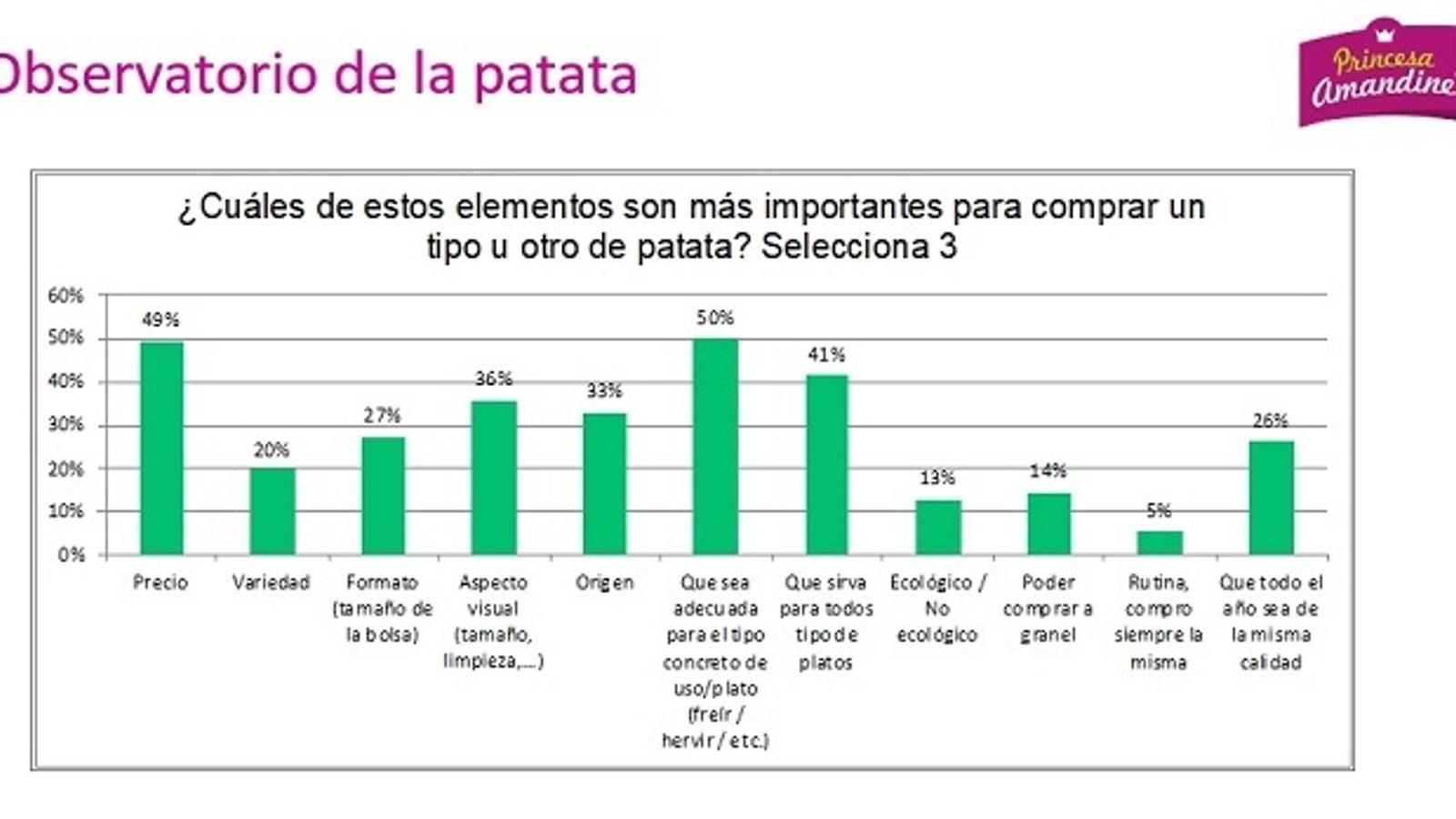 Además, el 50% de los consumidores se deciden por un tipo u otro de patata buscando que sea la variedad adecuada para su uso. El 49% se fija en el precio y el 41% que sirva para todo tipo de platos.