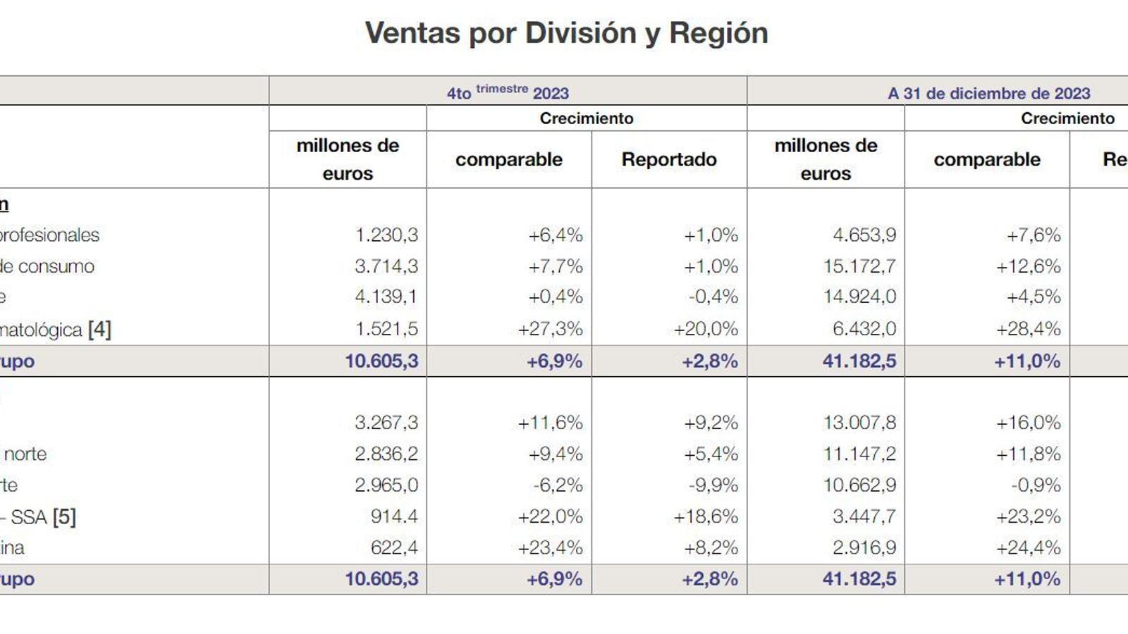 Las cifras arrojan mejorías del negocio en casi todas las zonas geográficas y en términos globales, como puede observarse en el cuadro: en Europa, como su principal mercado, las ventas subieron hasta 3.267 millones de euros, el 11,6% más respecto al cuarto trimestre de 2022 en términos comparables; y en Estados Unidos, la subida fue del 9,4%, hasta unos ingresos de 2.836 millones. Sumando el desempeño de todas las divisiones geográficas, la compañía vendió productos en el cuarto trimestre por valor de 10.605,3 millones de euros, lo que se traduce en un 6,9% más en términos comparables.