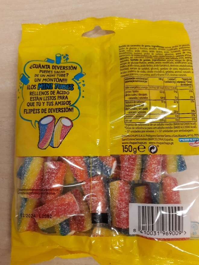 La Agencia Española de Seguridad Alimentaria y Nutrición (Aesan) ha lanzado una alerta alimentaria relativa a presencia de gluten no incluido en el etiquetado del surtido de caramelos de goma Sour Mini Tubes de la marca Chupa Chups.