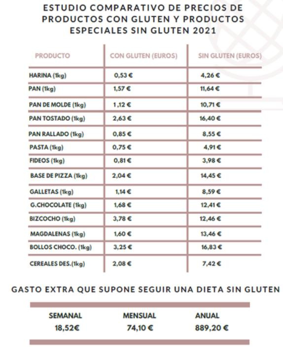 La Asociación de Celíacos y Sensibles al Gluten acaba de actualizar su informe de precios en el que analizan la diferencia de precio anual que conlleva la cesta de la compra sin gluten con respecto a una con gluten.