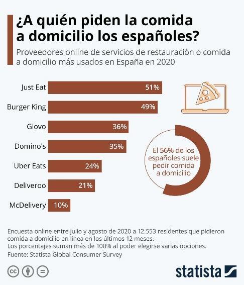 Este análisis señala a Just Eat como la plataforma de comida a domicilio preferida por el 51% de los españoles. Durante la pandemia esta plataforma ha incorporado 8.000 restaurantes a su aplicación computando un total de más de 16.000 y tiene presencia en 24 países. Le siguen en esta clasificación Burger King (49%), Glovo (36%), Domino's (35%), Uber Eats (24%) y Deliveroo (21%).