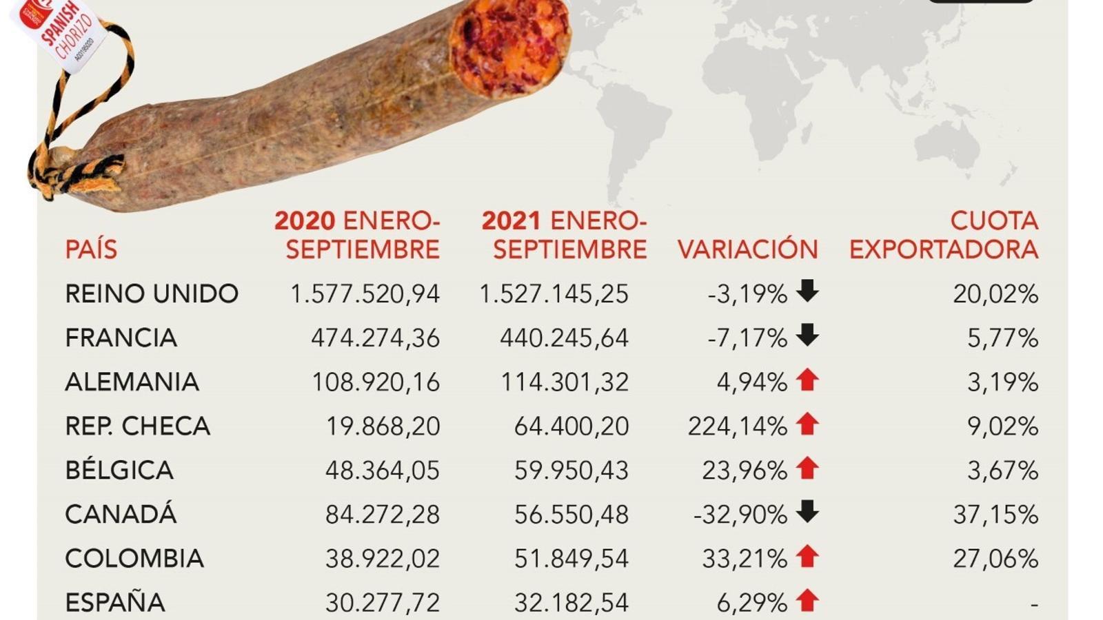 Atendiendo a las cifras de exportación del sector cárnico, este ha crecido el 11,36% respecto a 2020, lo que supone una cifra cercana a los 54,5 millones de kilos de embutido comercializado en el exterior. También ha incrementado el valor de estas exportaciones en un 11,34%, hasta superar la cifra de 350 millones de euros.