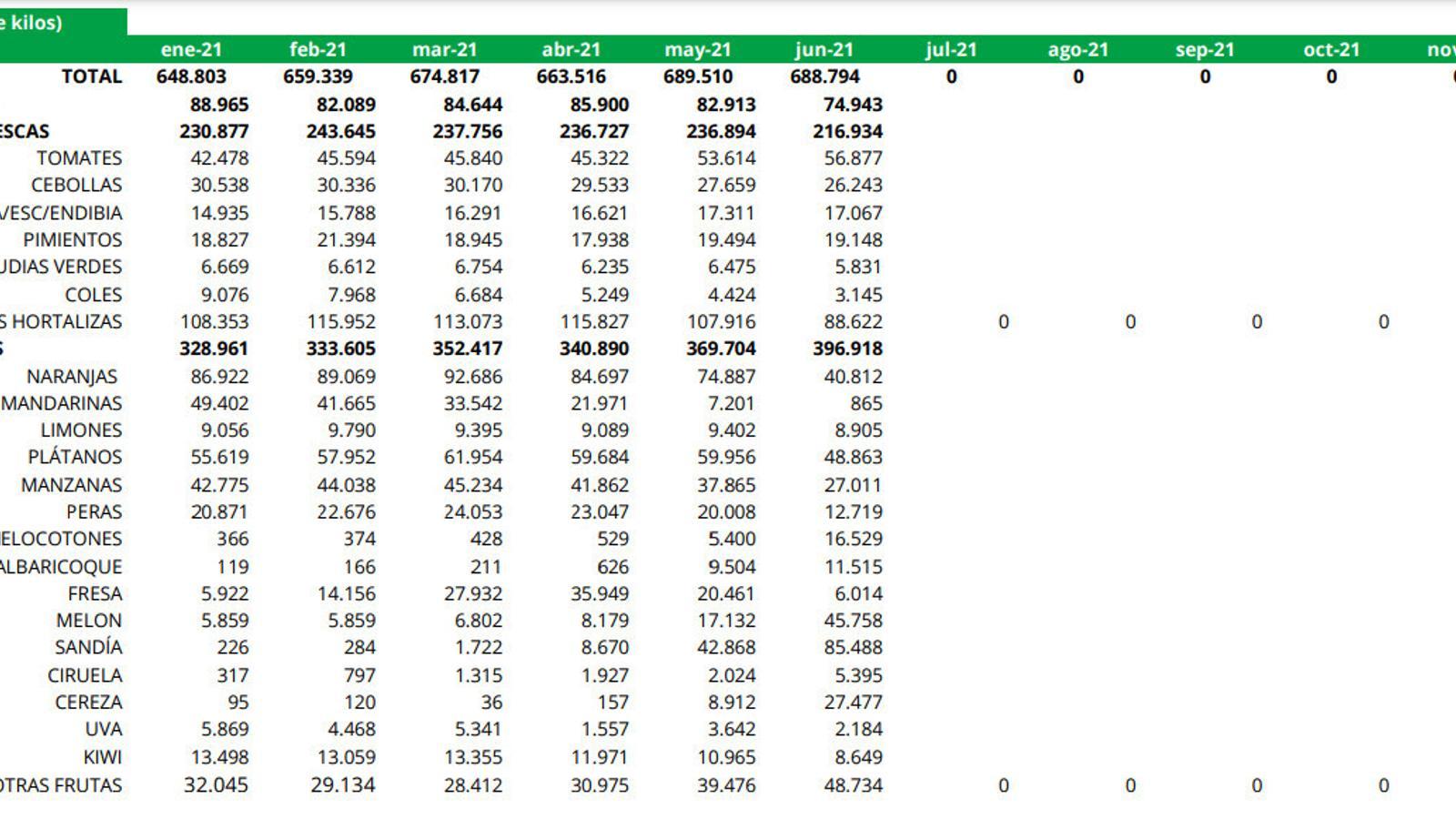 El consumo de frutas y hortalizas en el primer semestre del 2021 ha caído el 8,37% con relación al mismo mes de 2020, pero aumenta con respecto al año 2019, según datos del Ministerio de Agricultura, Pesca y Alimentación (Mapa).