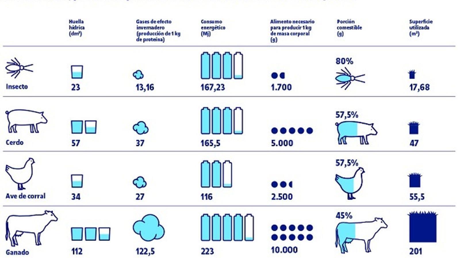 El uso de insectos como alimento de consumo humano, destaca el estudio de la UOC, podría reunir estas demandas y demostrar ser una estrategia válida para mejorar la seguridad alimentaria global. Se debe tener presente que los insectos pueden crecer en restos orgánicos (actuando como bioconvertidores), ocupar un menor espacio de producción y generar menos gases invernadero. Además, comparando la obtención de insectos con la de carne de vacuno, la emisión de gases invernadero es el 95% inferior y el consumo de energía cae el 62%.