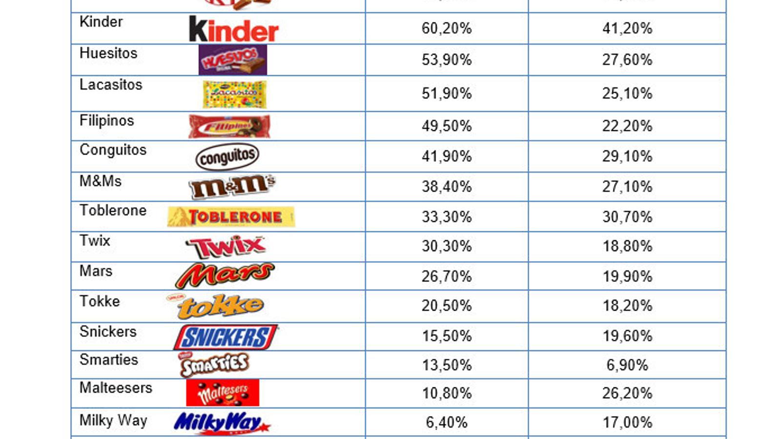 Las conclusiones señalan que las tres marcas más consumidas son, por este orden, KitKat, Kinder y Huesitos. Pero son Kinder, KitKat y Toblerone las que han alcanzado la mayor puntuación en el Índice de Recomendación. Huesitos es la tercera más consumida, pero en ese indicador cae hasta el puesto quinto. En el otro lado de la tabla, las tres marcas cuyos consumidores menos recomendarían son: Milky Way, Bounty y Smarties. Y las tres menos consumidas: MilkyWay, Hersheys y Bounty.