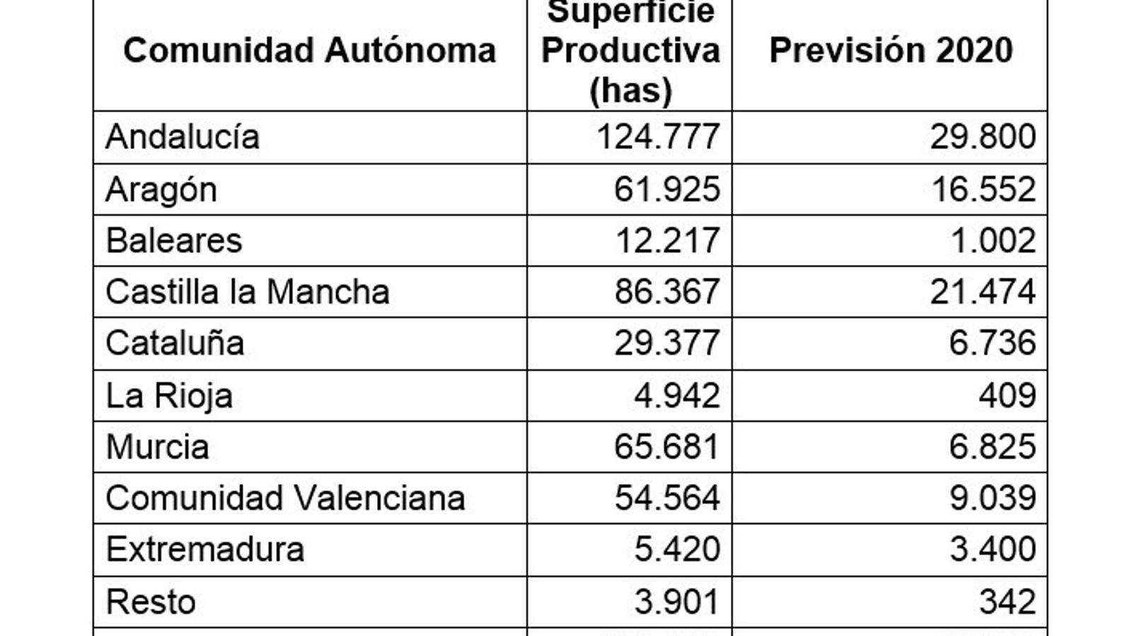 Andalucía, con una previsión de 29.800 toneladas, seguida de Castilla-La Mancha (21.474) y Aragón (16.552) son las comunidades con las cifras más elevadas para la citada campaña de este producto. En total, se superarán las 449.000 hectáreas de superficie productiva en nuestro país.