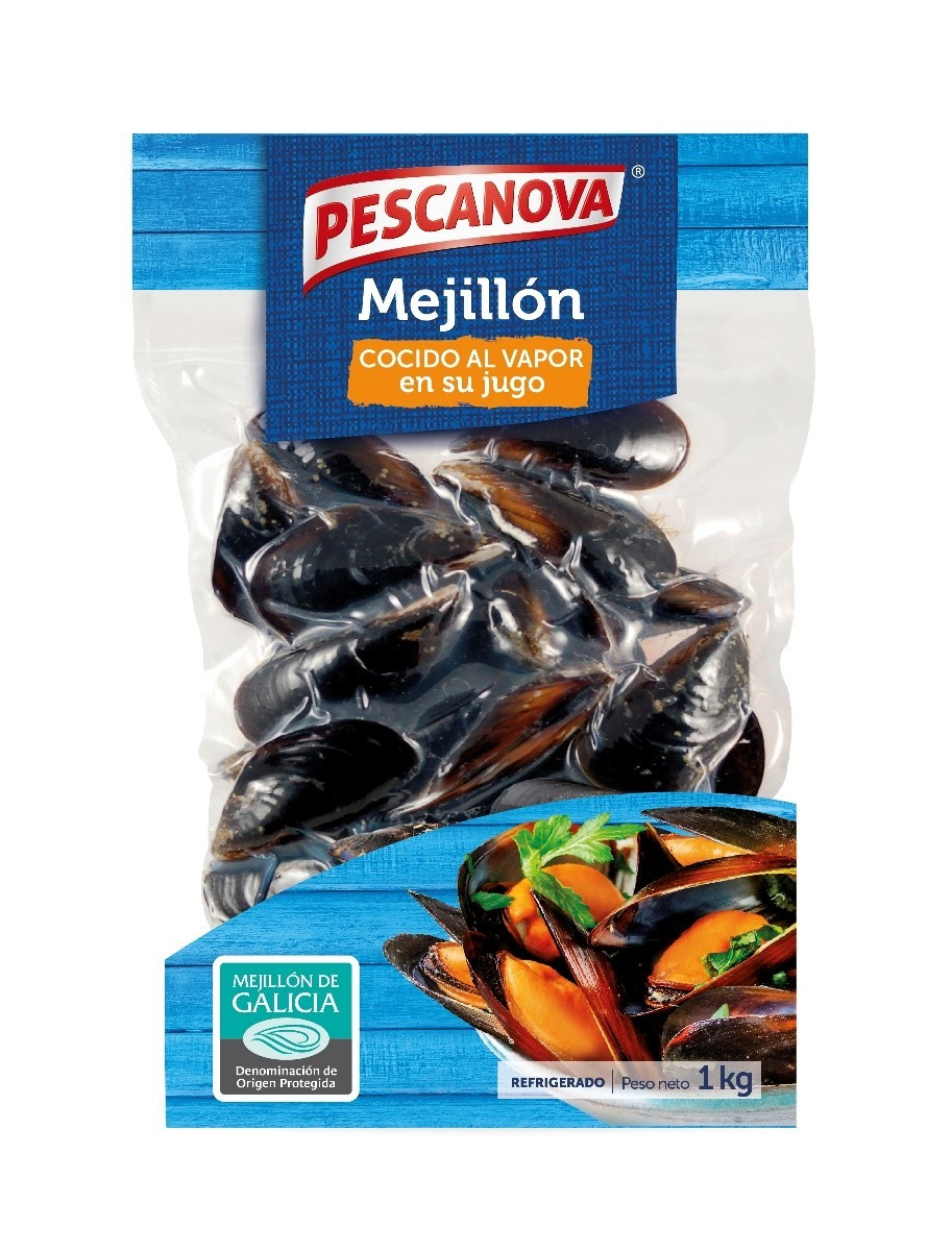 El Mejillón cocido entero en su jugo se sirve envasado al vacío en una bolsa de 1kg que incluye hasta 45 piezas, y el Mejillón cocido media concha al natural se encuentra en una bandeja de 500g (hasta 80 piezas).