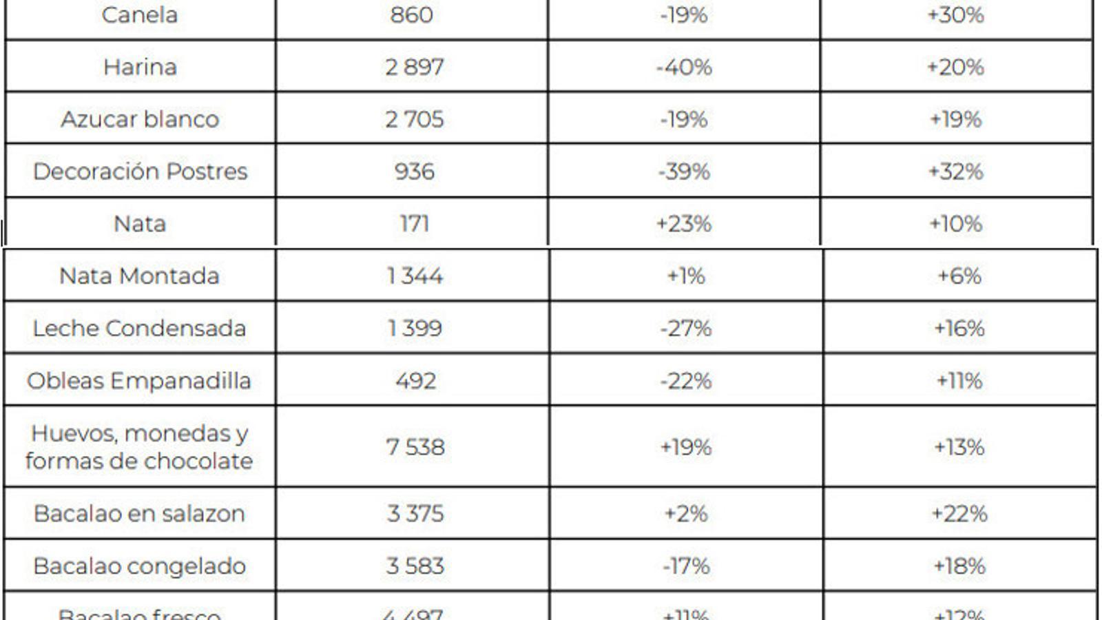 En esta temporada festiva, algunas categorías adquieren especial importancia en sus ventas en relación con su rendimiento durante el resto del año. Los ingredientes de la cocina casera, como la canela, la harina, el azúcar, la nata, las obleas para empanadilla o la leche condensada, y los productos típicos de esta época, como las tortas de hojaldre, los chocolates, el bacalao y el cordero, son los protagonistas de la Semana Santa cada año.