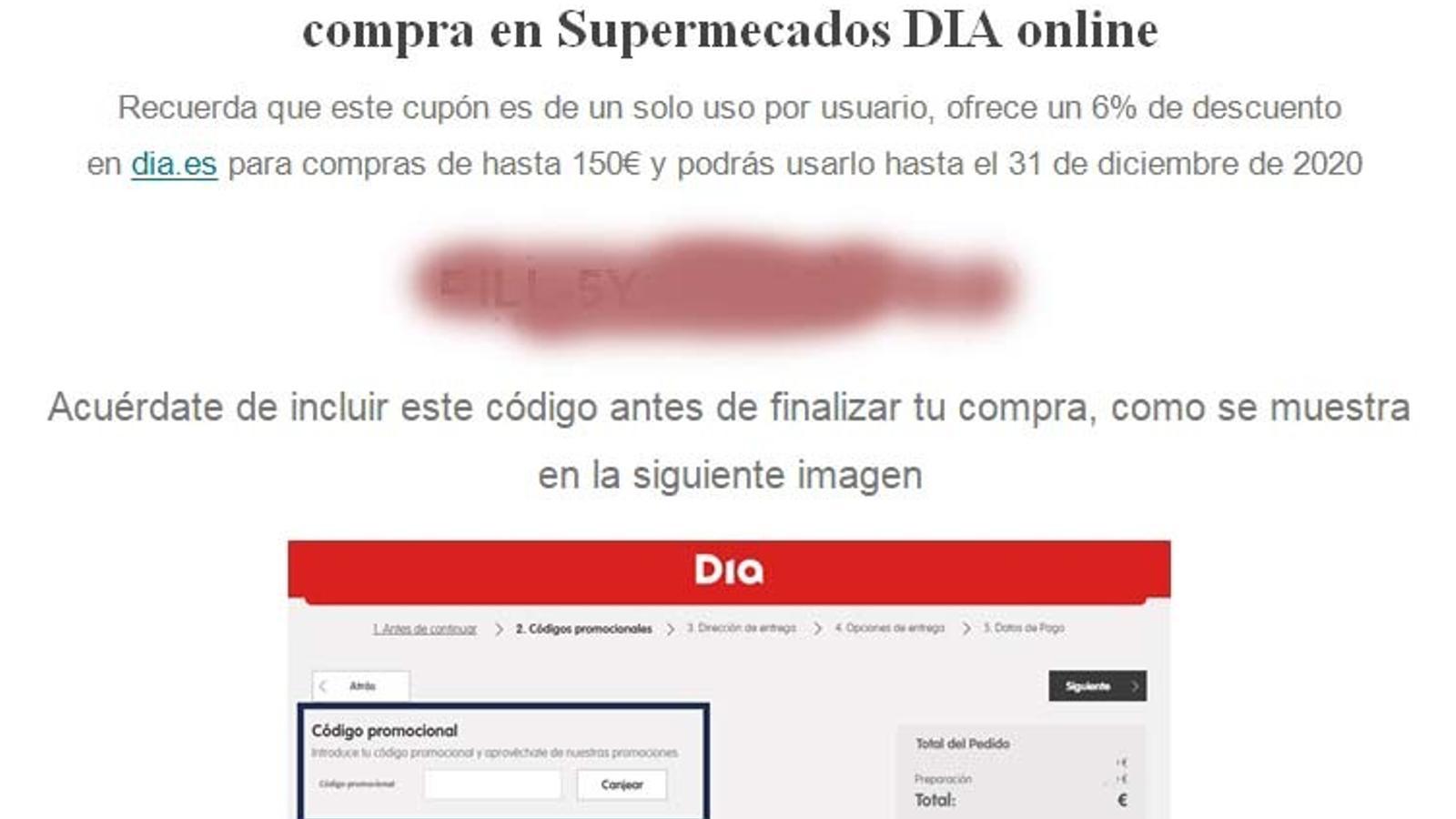 Te habrá llegado a tu correo tu código promocional (uno por email). Recuerda meter este código antes de finalizar tu pedido en Dia online, para que te hagan el descuento. Este es el mensaje que te llegará: