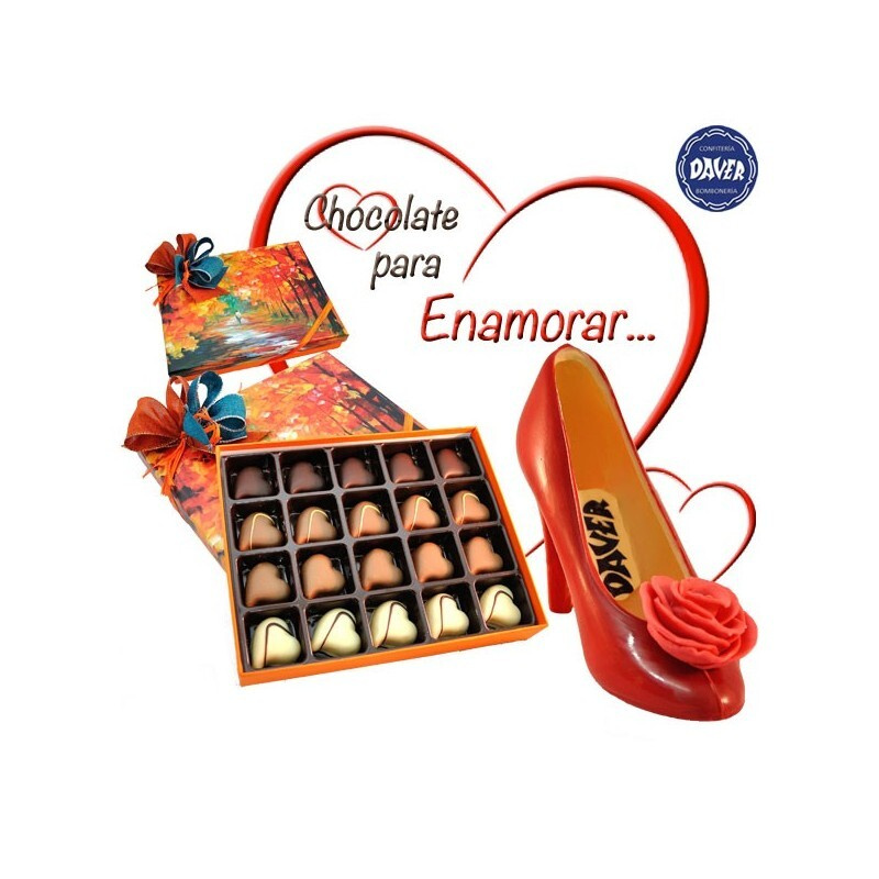Literalmente, porque lo que propone Confitería Daver para San Valentín es un zapato, como si fuera el de Cenicienta, pero de chocolate con leche, realizado en chocolate blanco, con una capa de manteca de cacao de color rojo. Y además una cajita de bombones variados, con formas de corazón de su colección 'Acuarelas'.