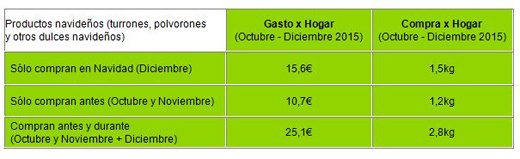 Según confirma el informe El consumo en Navidad elaborado por la consultora, a pesar de que diciembre sigue siendo el mes que concentra más ventas para los productos de alimentación típicos de estas fechas, en los últimos quince años se han ido adelantando estas compras a noviembre, e incluso octubre. Este adelanto de las compras se da especialmente en los productos más estacionales como son los turrones y los dulces navideños. El 43% de las ventas de turrones en 2015 se realizó fuera del mes de diciembre, ante el 31% en 2001. Por otra parte, los polvorones, mantecados y otros dulces típicos registraron un 56% de sus ventas en los meses anteriores y posteriores a la Navidad (34% en 2001).