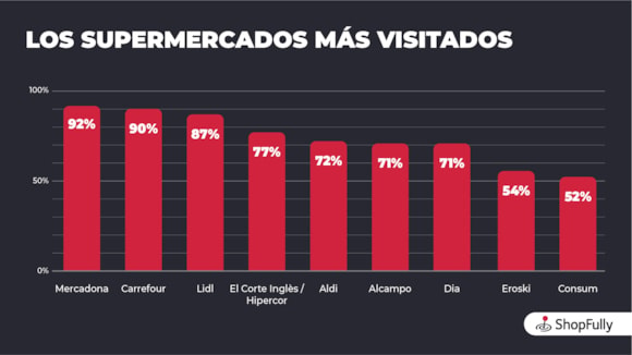 El estudio destaca a Mercadona como el supermercado más frecuentado por los españoles (92% lo visitan regularmente, principalmente debido a su cercanía a los hogares). Por su parte, Carrefour, visitado por el 90% de los consumidores, destaca por su amplia variedad de marcas y productos, mientras que Lidl es apreciado por el 87% de los españoles gracias a sus precios competitivos y promociones.