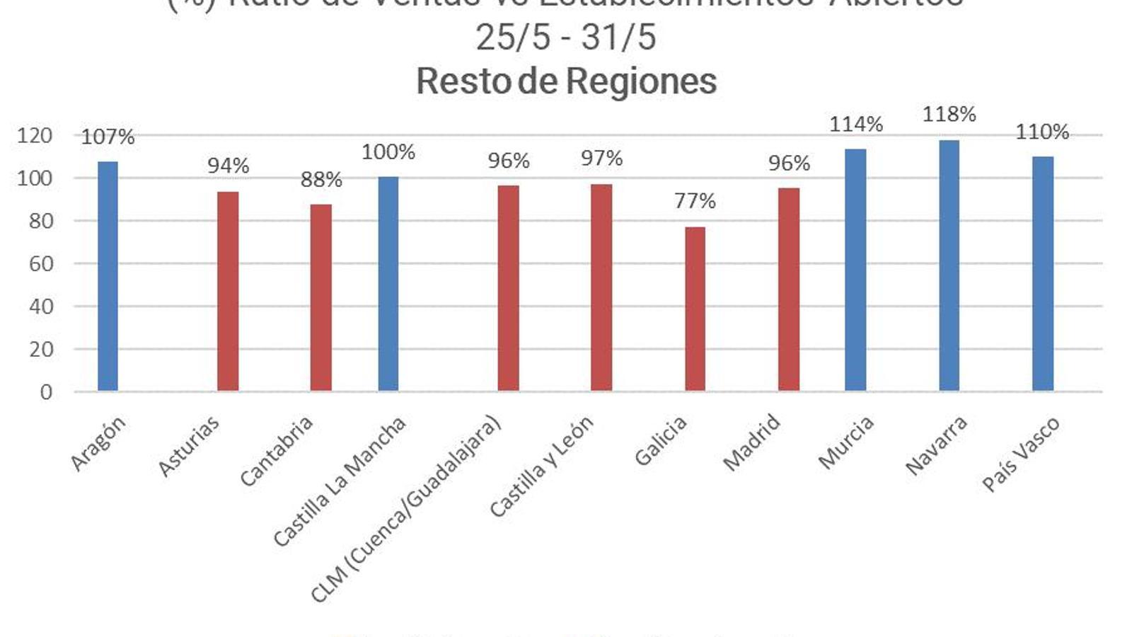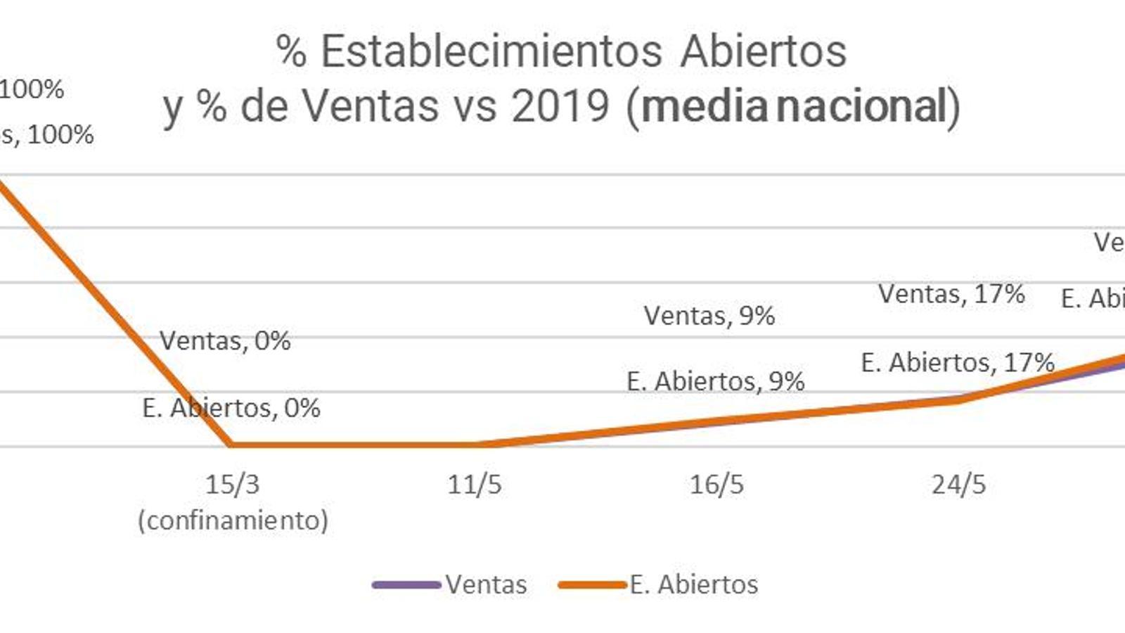 Si observamos los datos de la tercera semana empieza a haber una desalineación entre ambas cantidades. Es posible, en algunos casos, que al inicio de la desescalada, los establecimientos abiertos, al tener escasa competencia, vendieran por encima de lo que les correspondería.