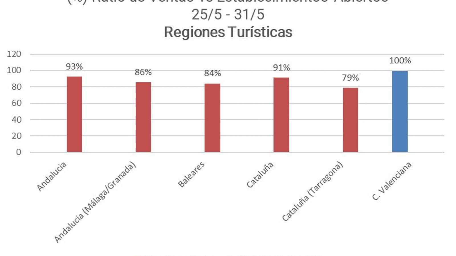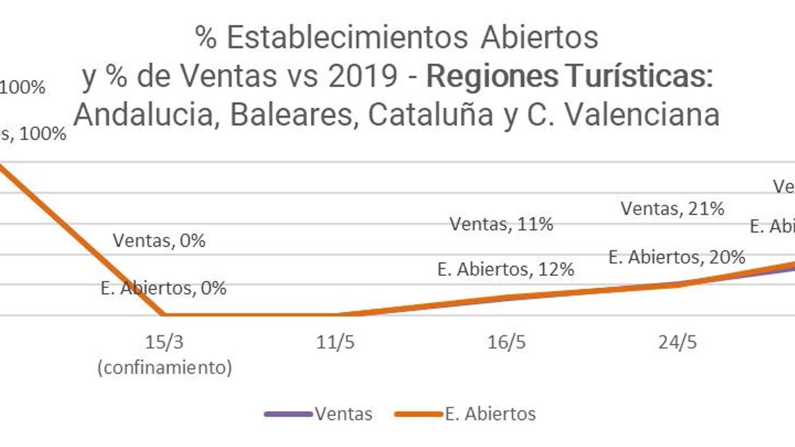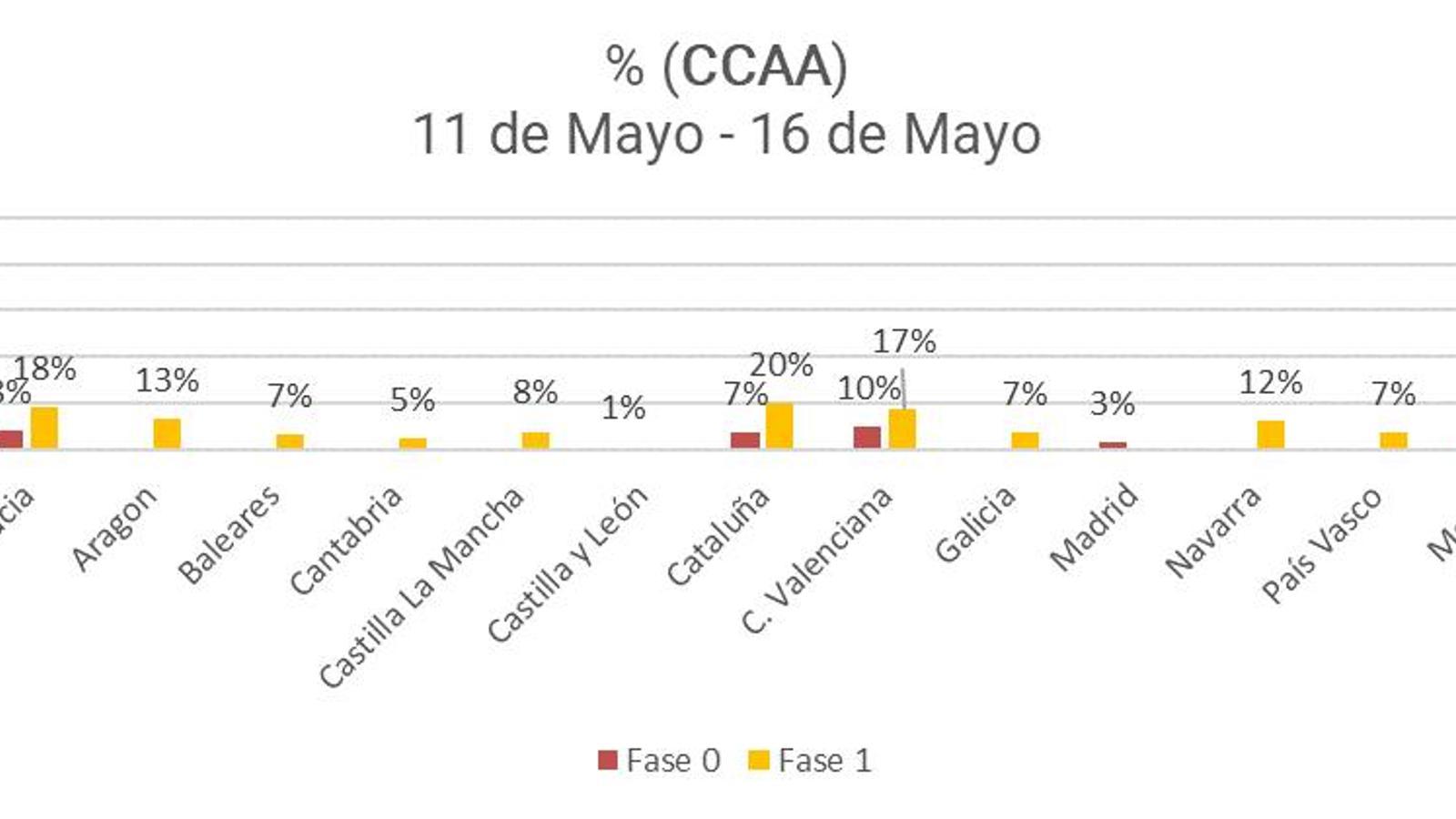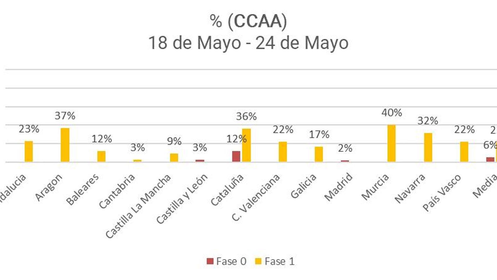 En este período puede certificarse ya un notable desarrollo de aperturas, encabezada por Aragón (35%) y Murcia (30%). Le siguen de cerca Cataluña y Comunidad Valenciana (27%), Andalucía (25%) y Navarra (23%). El resto, pendiente de cambio de fase, mantiene una actividad muy baja.
