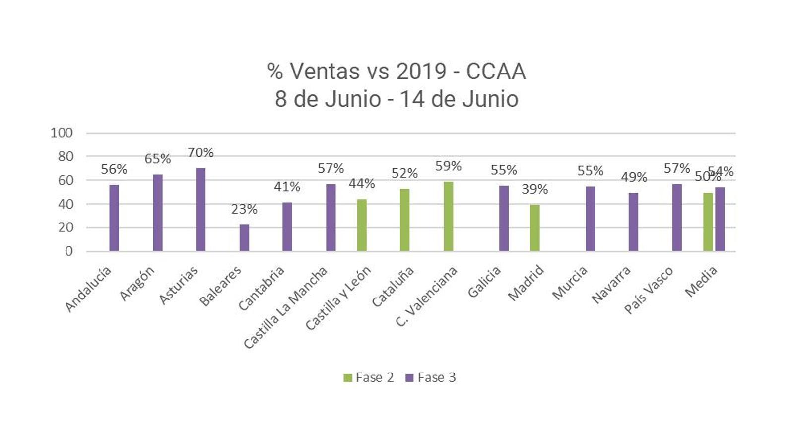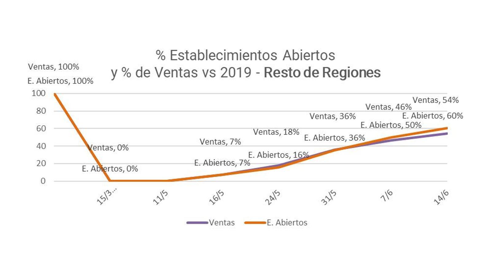 En esta gráfica pueden apreciarse varios efectos. El más visible, el efecto positivo de las primeras aperturas, con valores de venta por encima de lo previsible (es el caso de País Vasco, Navarra y Baleares). También es manifiesta la progresiva convergencia de todos los valores por debajo de los de las ventas -lógico- del año anterior.