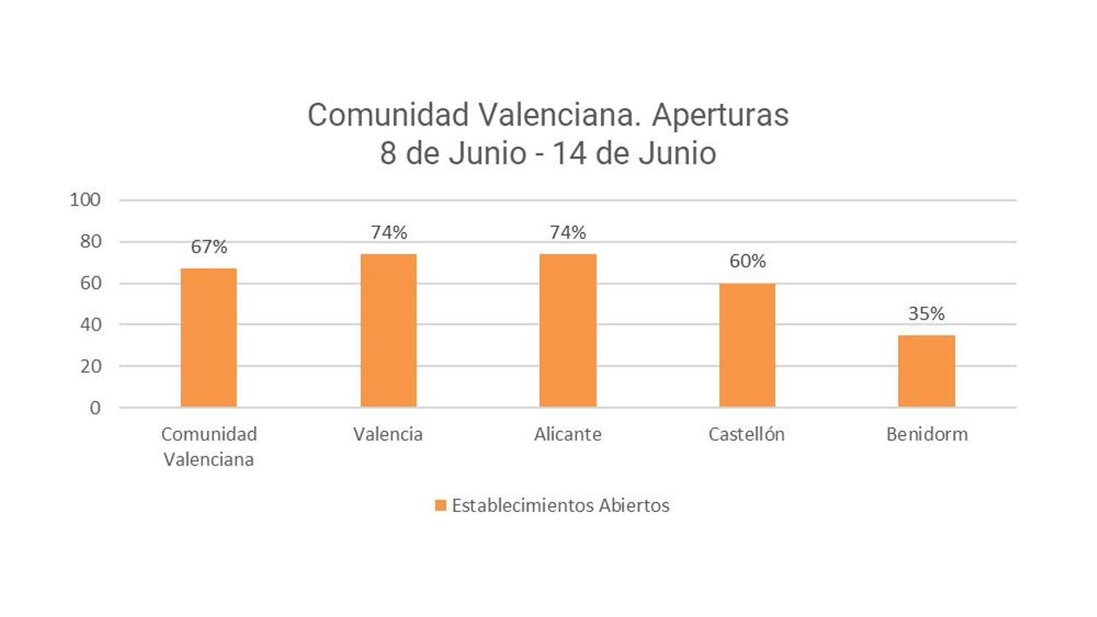 Si tomamos la Comunidad Valenciana como ejemplo, constatamos las enormes diferencias entre las ciudades de Valencia o Alicante, con tres de cada cuatro locales abiertos, respecto a otras claramente turísticas como Benidorm, donde apenas ha subido las persianas uno de cada tres bares y restaurantes.