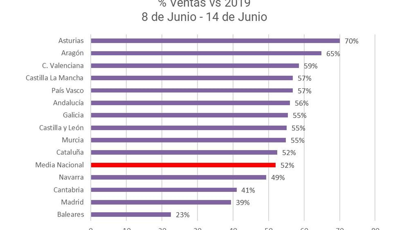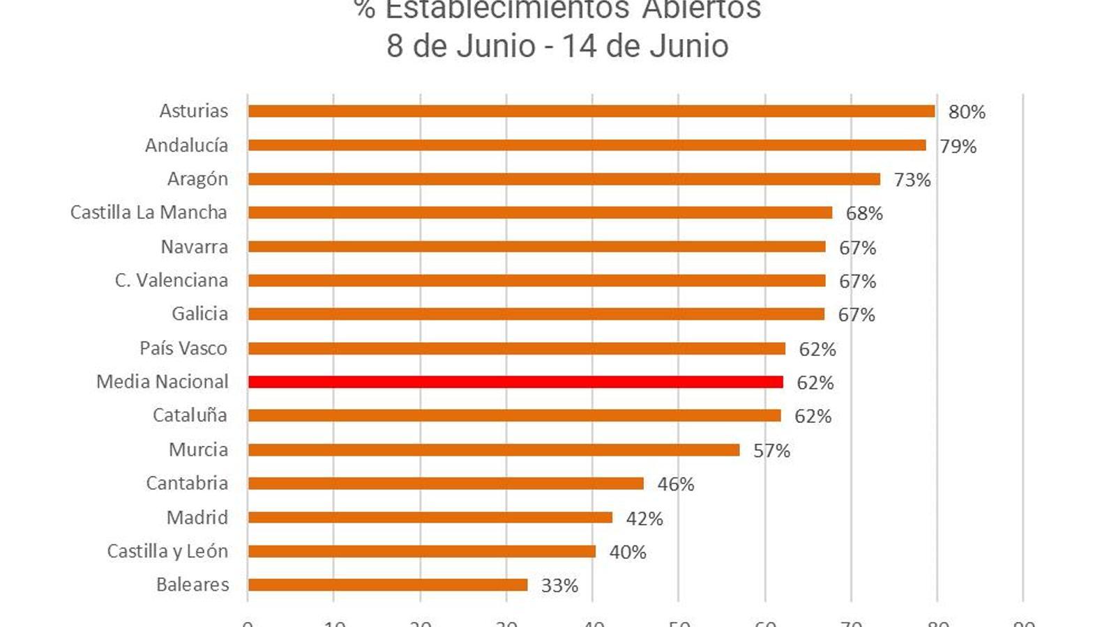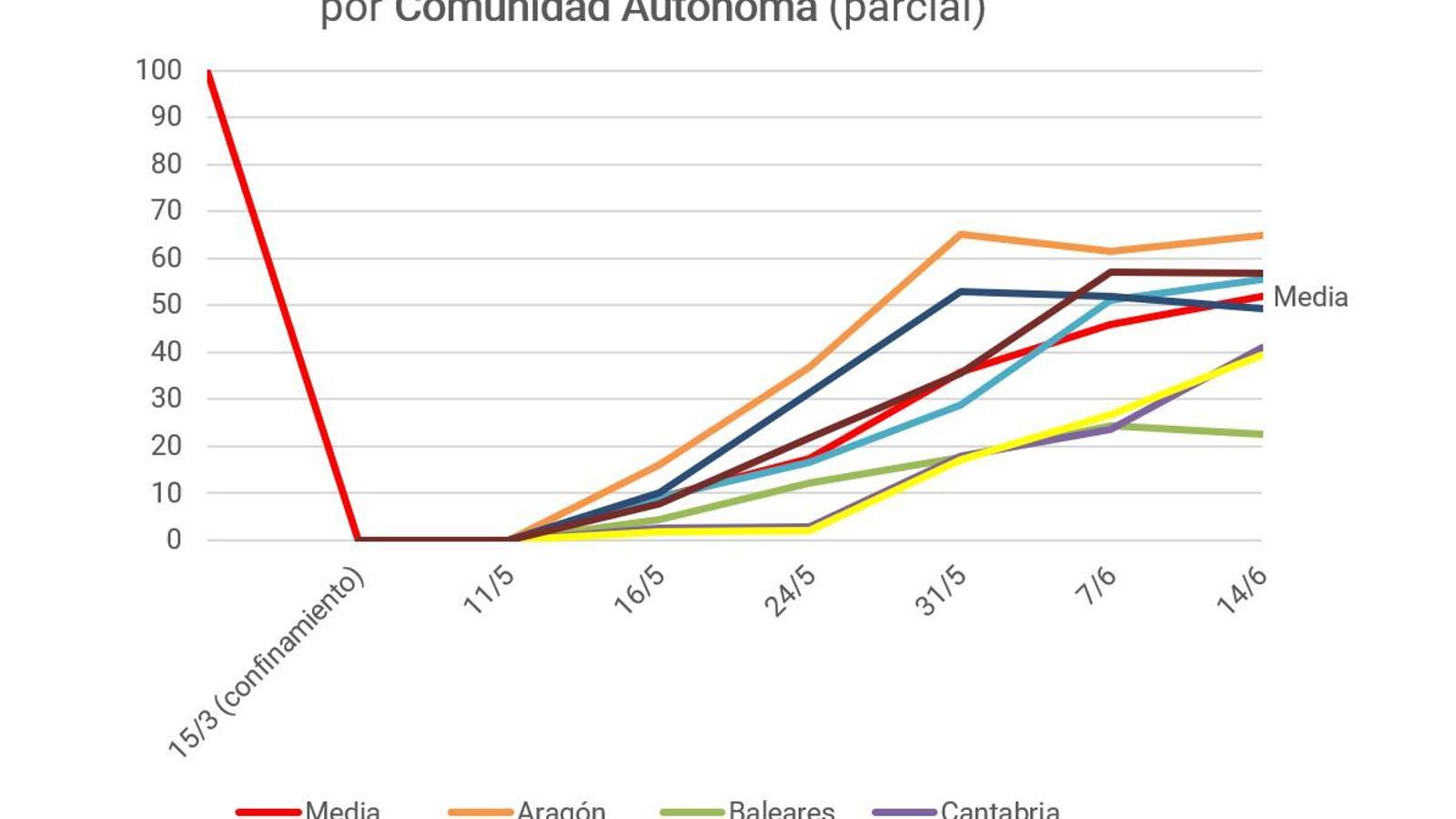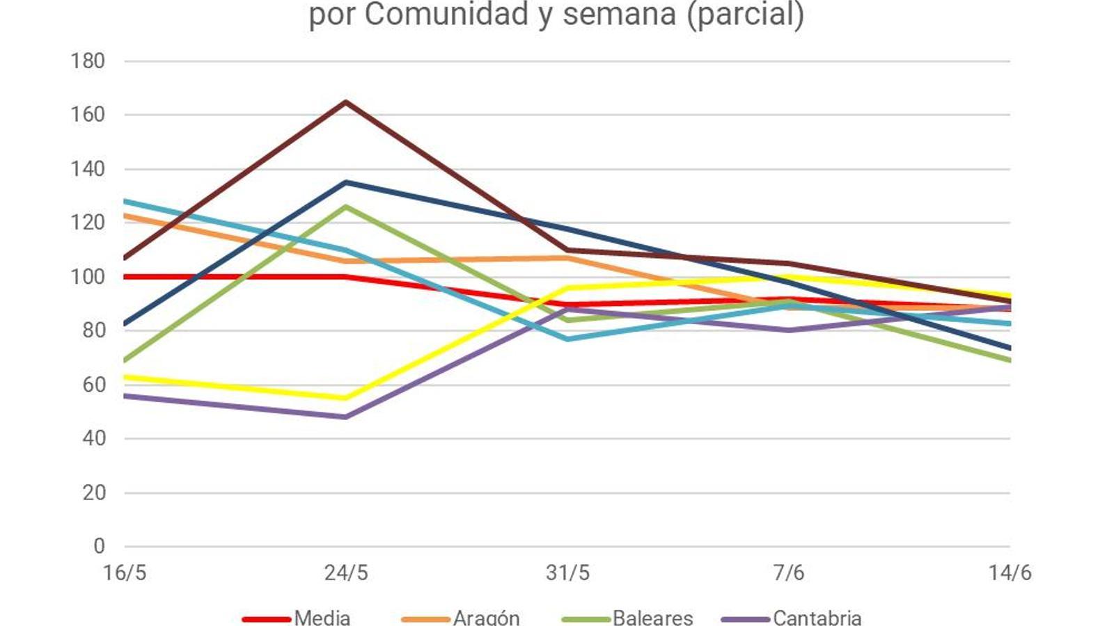 Durante la semana del 8 al 14 de junio se mantienen los tres grupos de la pasada semana. Asturias y Andalucía, con un índice de aperturas en el entorno del 80%, más Aragón (73%). El grupo de las regiones más atrasadas, con Baleares en la cola, seguida de Castilla y León, Madrid y Cantabria (entre el 33 y el 46%) y el resto con valores que oscilan entre el 55 y el 69%.