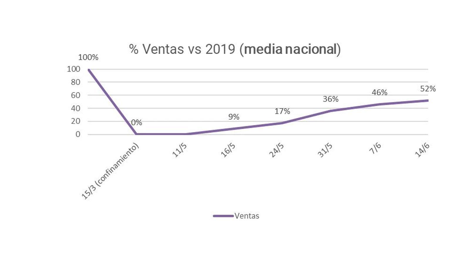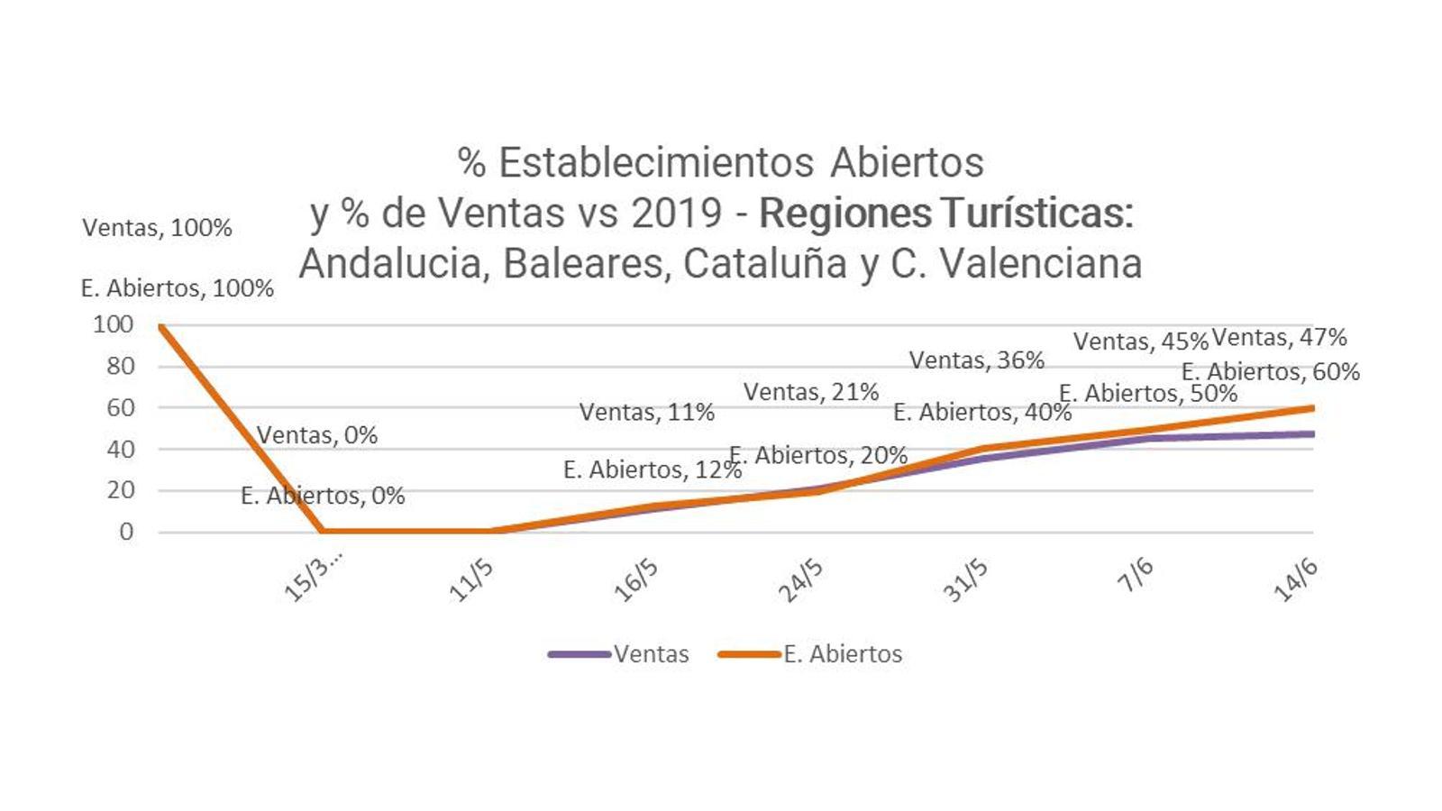 - Empieza a observarse una cierta ralentización de las ventas a medida que se van abriendomás negocios. Resulta más difícil obtener buenos resultados con capacidades de aforo y ocupación restringidas (en comparación con los datos del año anterior). Las aperturas han pasado del 50 al 62% (+12%) a nivel nacional, pero las ventas únicamente han crecido un 6%.