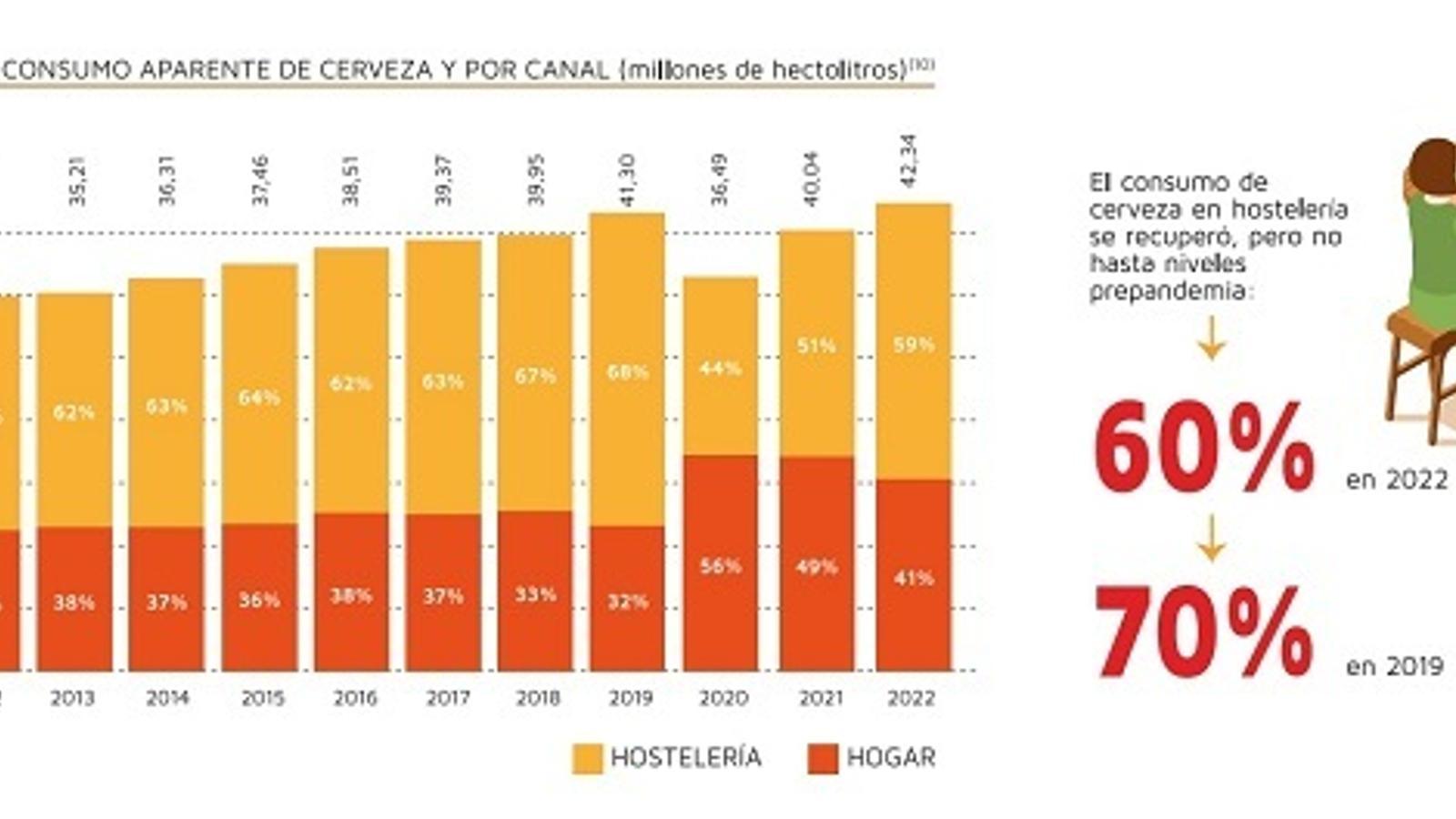 El consumo de cerveza en hostelería experimentó una notable mejora en 2022, con un incremento de casi el 32% respecto al año anterior, que se vio impulsado, entre otros factores, por el repunte del turismo en España. Sin embargo, no se alcanzaron los niveles previos a la pandemia: si en 2019 cerca del 70% de la cerveza se consumía fuera del hogar, en 2022 este índice se quedó por debajo del 60%. Las restricciones sanitarias al consumo en barras o de pie en los establecimientos de restauración se mantuvieron a comienzo de año, por lo que el sector hostelero todavía estaba lejos de instaurar la normalidad en su actividad.
