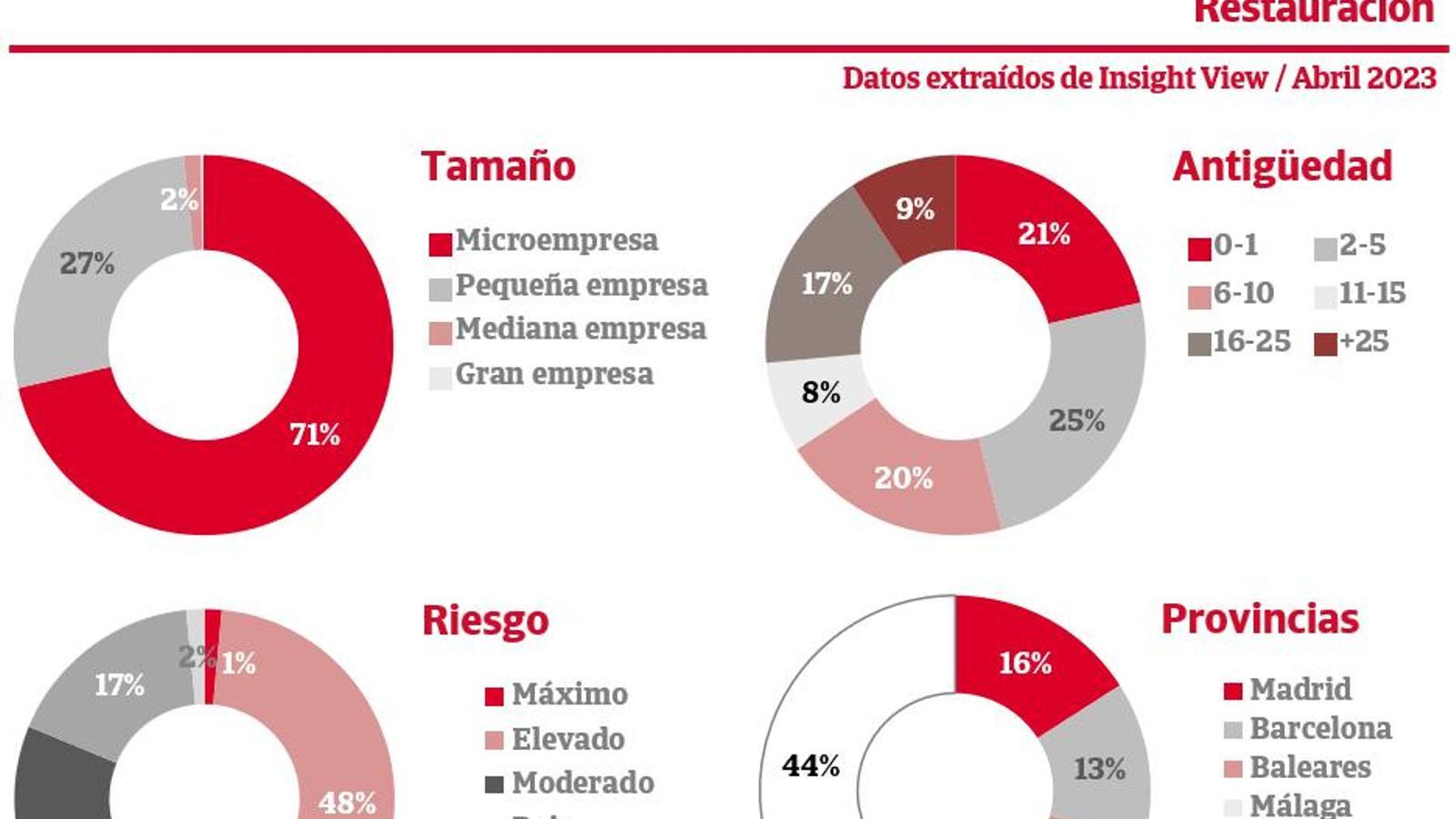 De acuerdo con los datos que ofrece Insight View, el 49% de las empresas de restauración presenta un nivel elevado o máximo de riesgo de impago. El riesgo es bajo o muy bajo en el 19% del tejido sectorial y moderado en el 32%. Se trata de valores muy similares a los que ya presentaba hace un año.