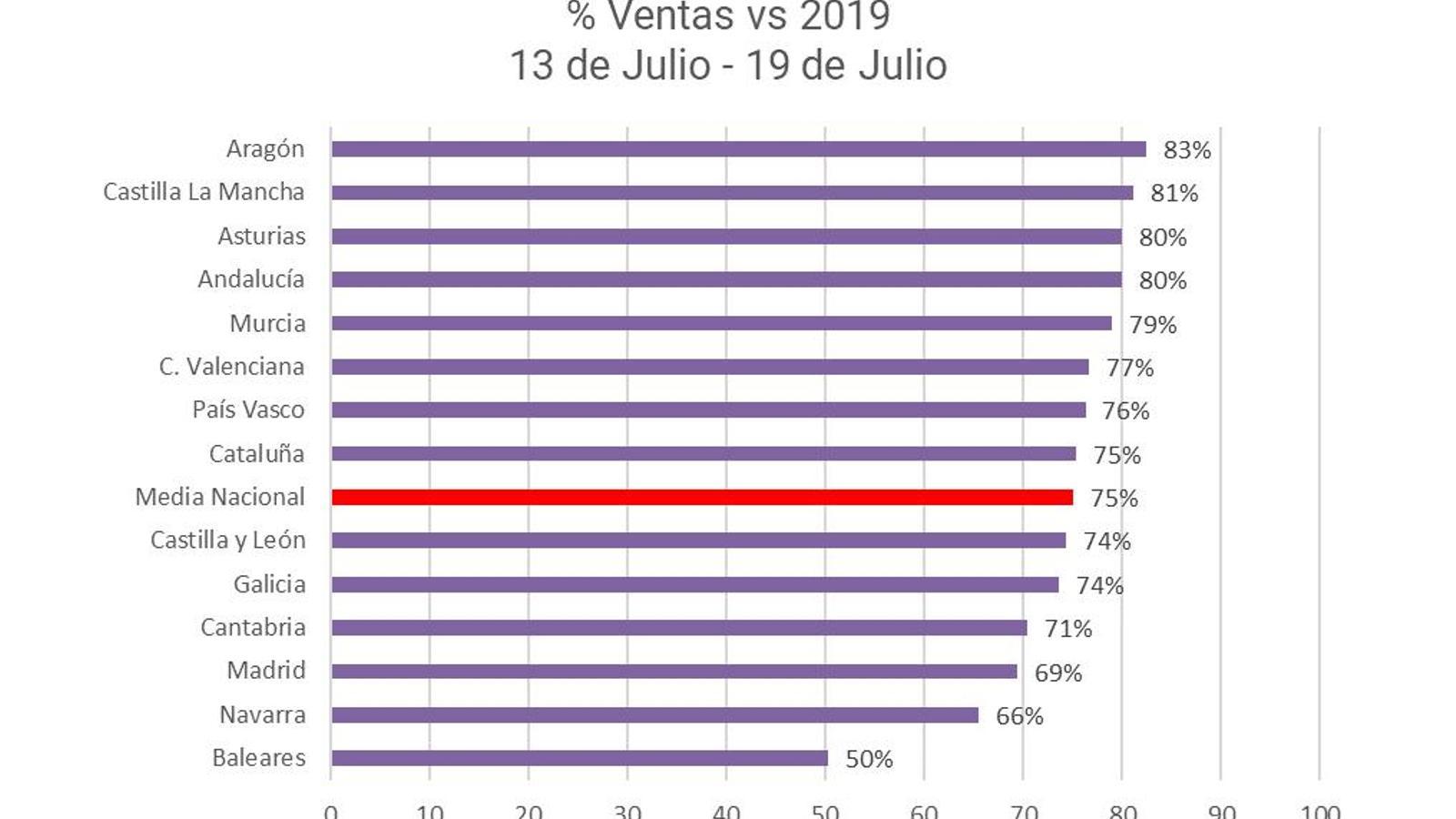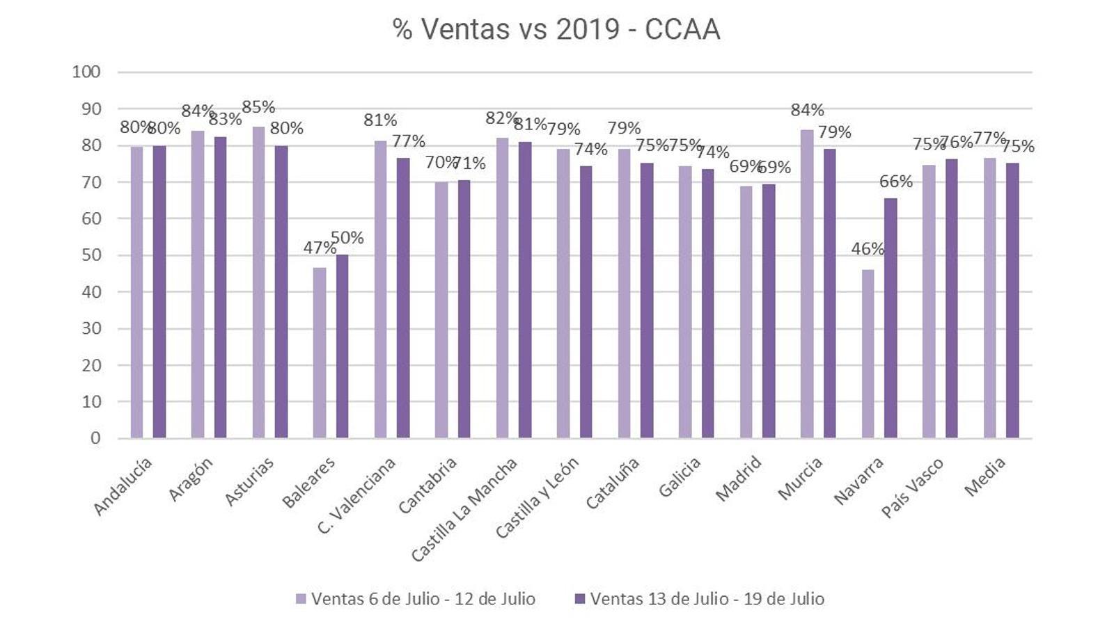 - Baleares, Madrid, País Vasco, Cantabria y Navarra, en cambio, suben de media 5 puntos el resultado de ventas de la semana anterior. Baleares sube 4 puntos, País Vasco 2 y Madrid y Cantabria solo 1 punto, y se sitúan de media en el 66% de las ventas del año anterior. Navarra sube de golpe 20 puntos porcentuales.