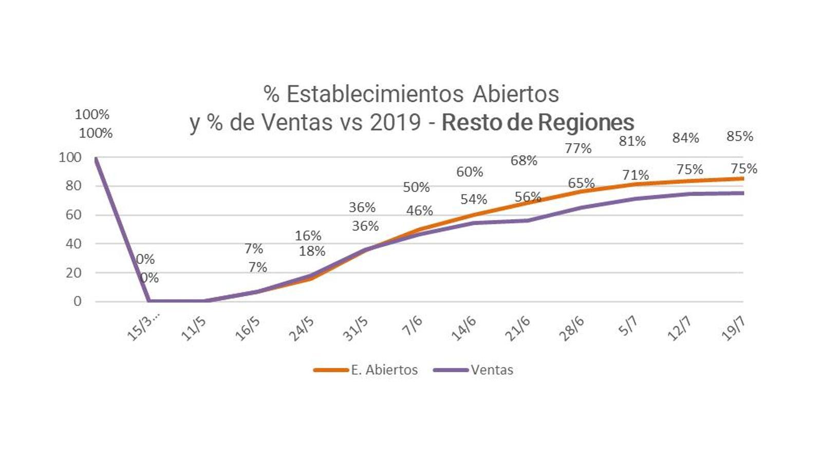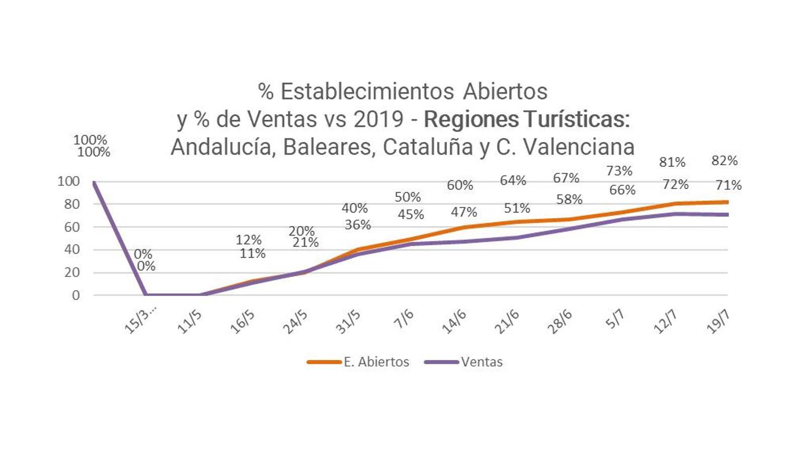 - En Cataluña se reduce 5 puntos porcentuales los establecimientos abiertos (de 85% a 80%) y 4 puntos las ventas (de 79% a 75%) sobre lo alcanzado la semana anterior. En Lleida (zona con restricciones) ha cerrado el 20% de los establecimientos que ya habían abierto y la actividad de la hostelería está al 65% del año anterior.