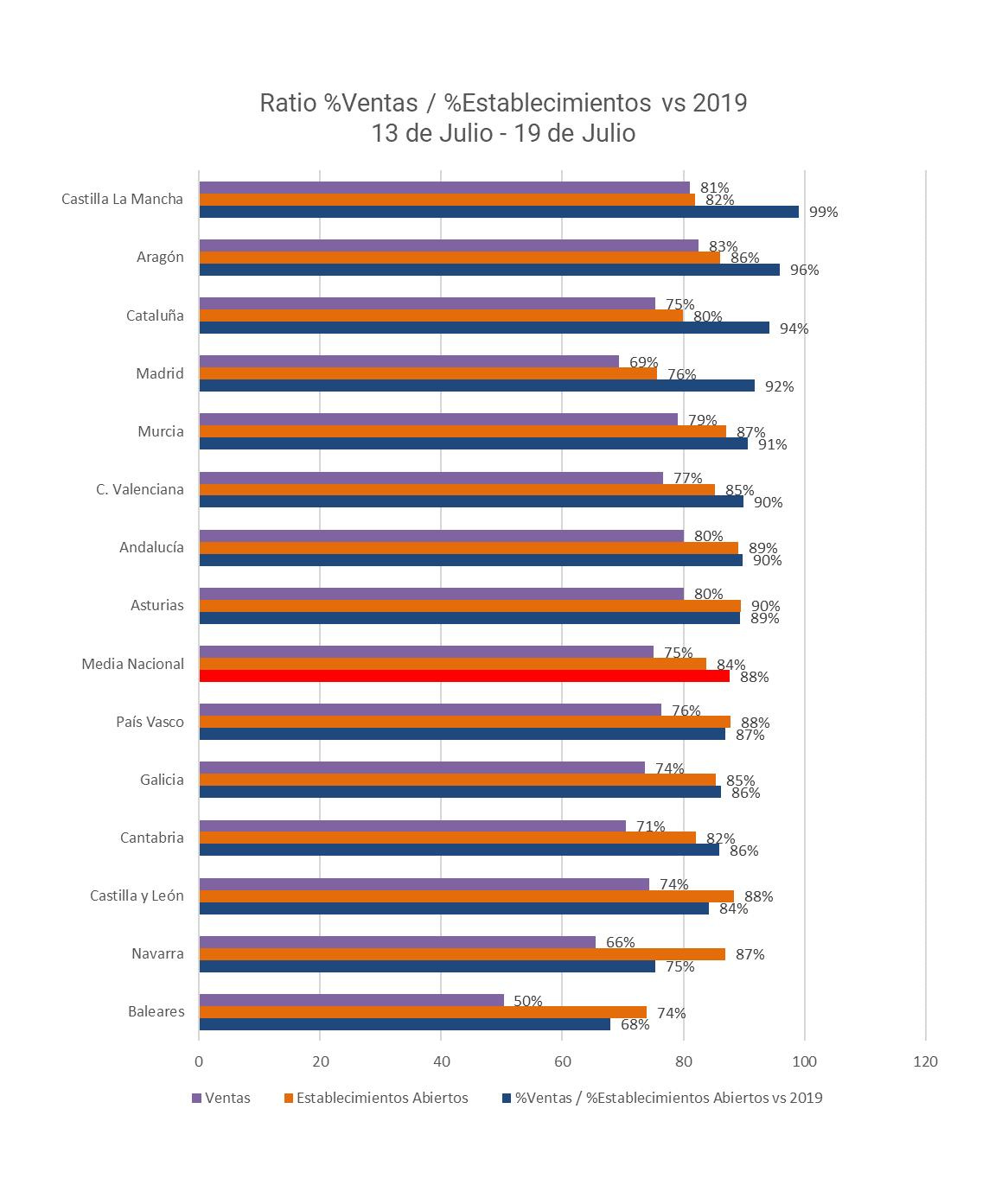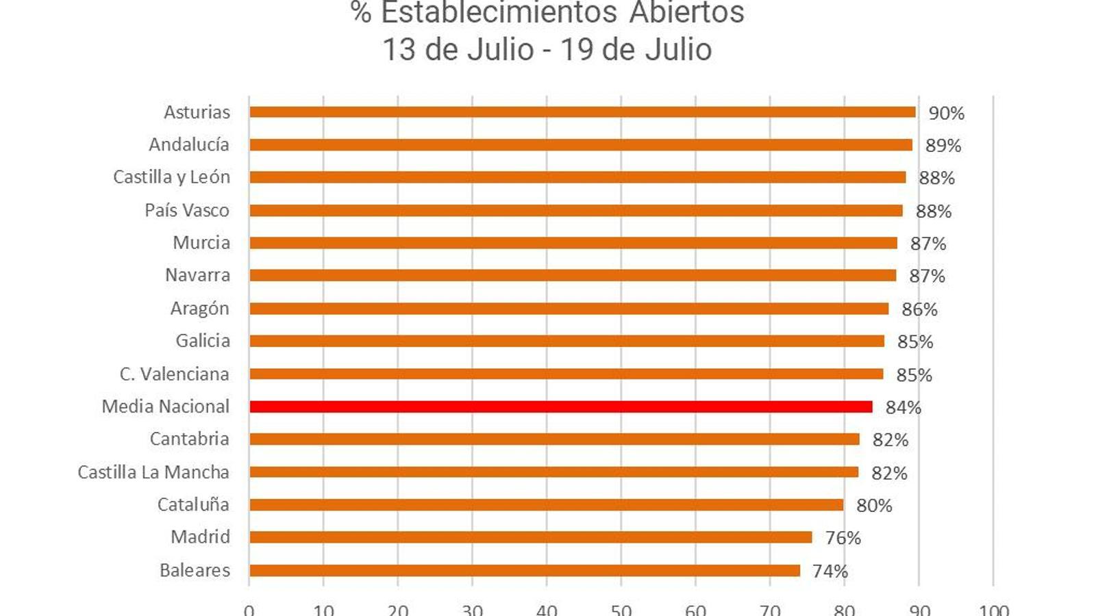- Las seis Comunidades con más establecimientos abiertos en esta semana del 13 al 19 de Julio (Asturias, Andalucía, Castilla y León, País Vasco, Murcia y Navarra) alcanzan de media el 88% de reaperturas, pero la actividad total de la hostelería cae de media el 24% respecto al año anterior.