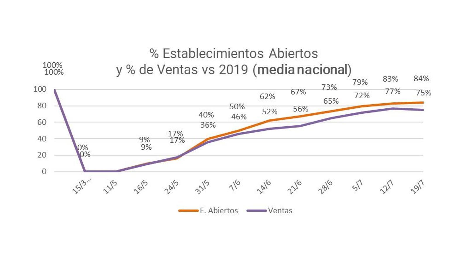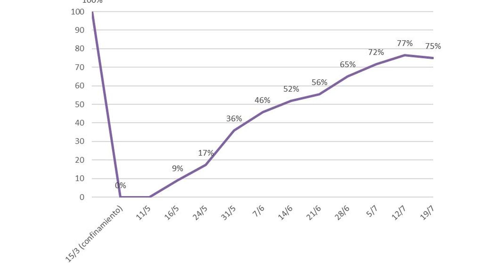 Las reaperturas se frenan. En la tercera semana de julio los establecimientos abiertos aumentan solo un punto porcentual. La curva se aplana y en esta ocasión no es una buena noticia.