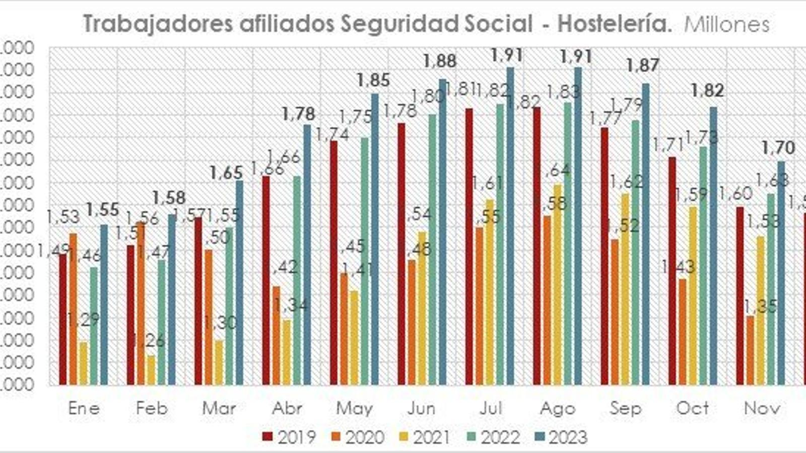 El sector de la hostelería contó en 2023 con una media cercana a 1,8 millones de trabajadores afiliados a la Seguridad Social, cifra que supone casi 90.000 más que el año anterior (+5,3%), según los datos de afiliación del Ministerio de Trabajo recogidos por Hostelería de España.