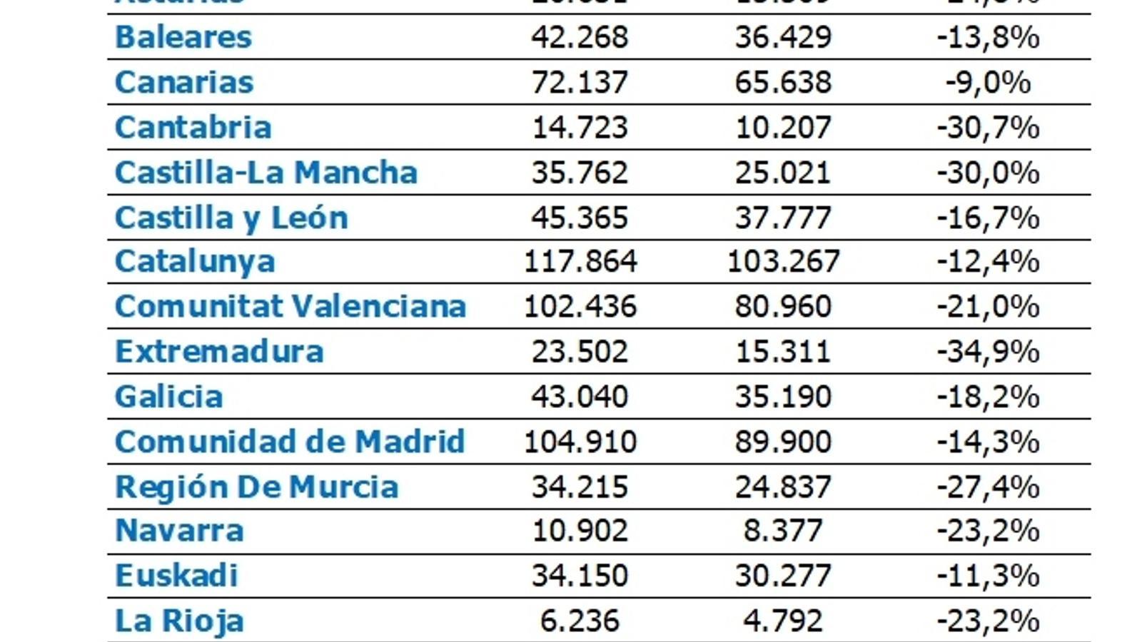 Con descensos mayores a la tasa nacional se encuentran Comunidad Valenciana (-21%), La Rioja (-23,2%), Navarra (-23,2%), Asturias (-24,8%), la Región de Murcia (-27,4%) y Andalucía (-28,1%). Las caídas más pronunciadas, mayores al 30%, tuvieron lugar en Castilla-La Mancha (-30%), Cantabria (-30,7%) y Extremadura (-34,9%).