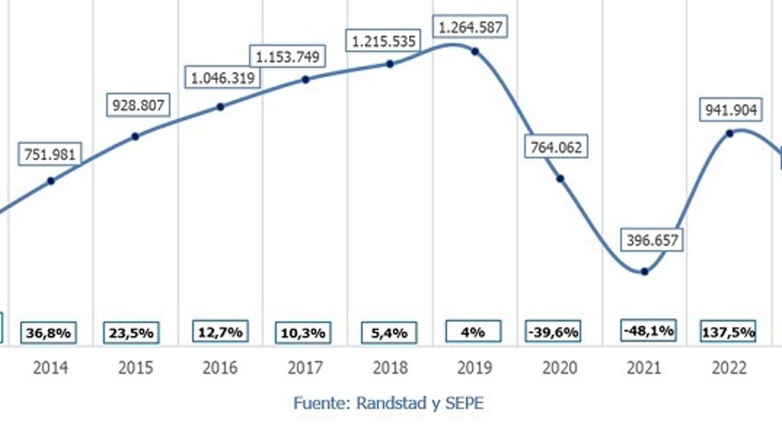 Este volumen es apenas el 1,2% inferior al mismo periodo de 2020, que coincide con la irrupción de la pandemia, periodo en el que se registraron 764.062 rúbricas. De hecho, estudiando la evolución de los primeros cuatro meses de los últimos diez años, se observa que este indicador sectorial no dejó de crecer hasta el 2019, cuando se registraron alrededor de 1.264.587 contratos, la mayor cifra del periodo estudiado. Con el comienzo de crisis sanitaria al año siguiente, este volumen comenzó a descender, hasta desplomarse en 2021, con 396.657 contratos en hostelería. Al año siguiente, en 2022, las firmas en el sector crecieron hasta las 941.904 firmas, para después reducirse el 19,9%, registrando los más de 750.000 contratos actuales.
