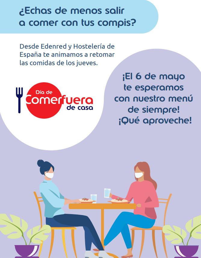 Hostelería de España y Edenred, especialista en soluciones de pago para las empresas, han promovido la celebración el 6 de mayo del Día de Comer Fuera de Casa. Esta idea busca "animar a las personas a salir del hogar y disfrutar de una comida en sus restaurantes de siempre", explican en un comunicado.