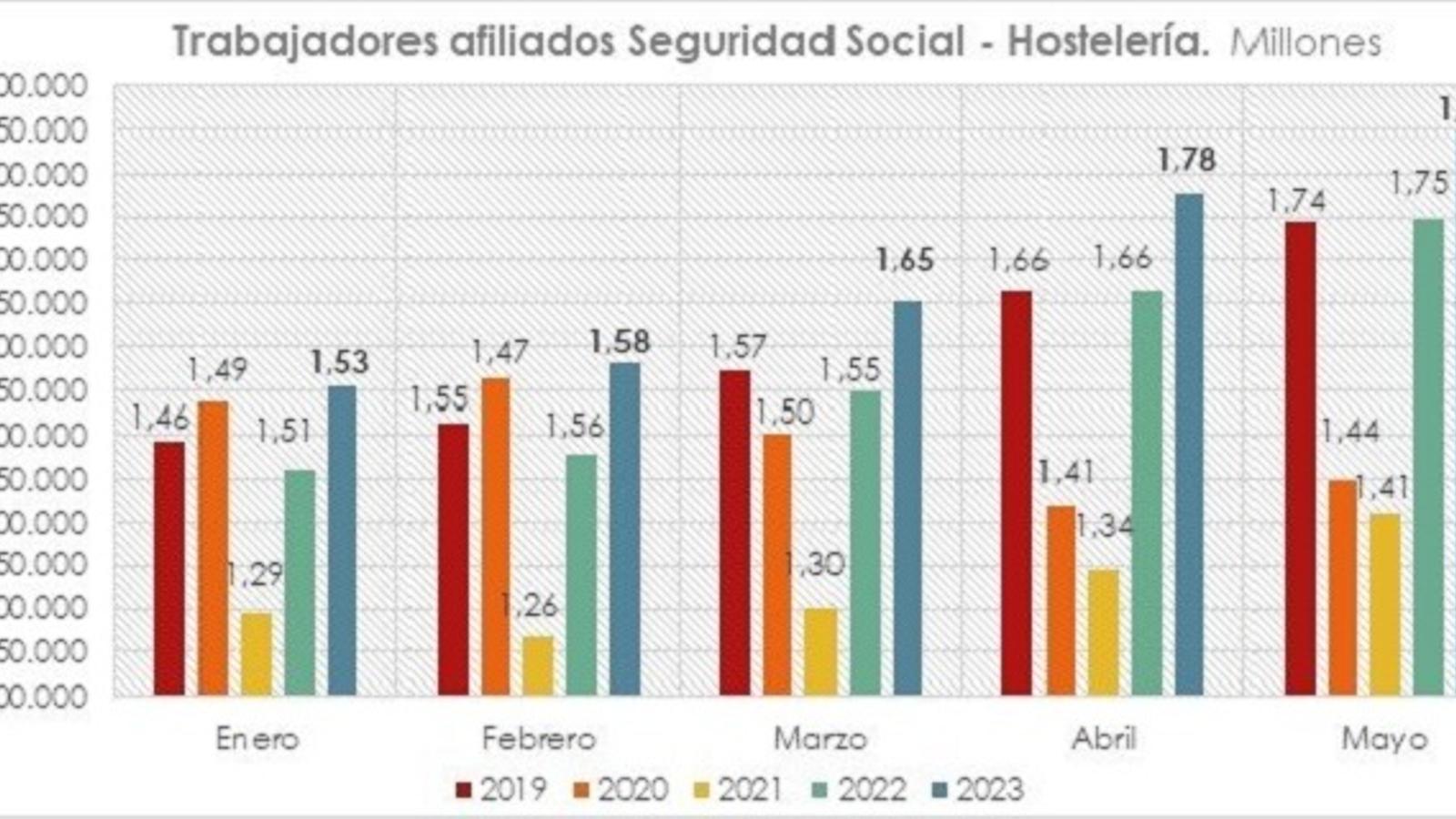 El sector de la hostelería alcanzó en mayo una media de 1.846.885 trabajadores afiliados a la Seguridad Social, que supone el 5,6% más que en el mismo mes del año anterior, según los datos de afiliación del Ministerio de Trabajo que recoge la patronal Hostelería de España.