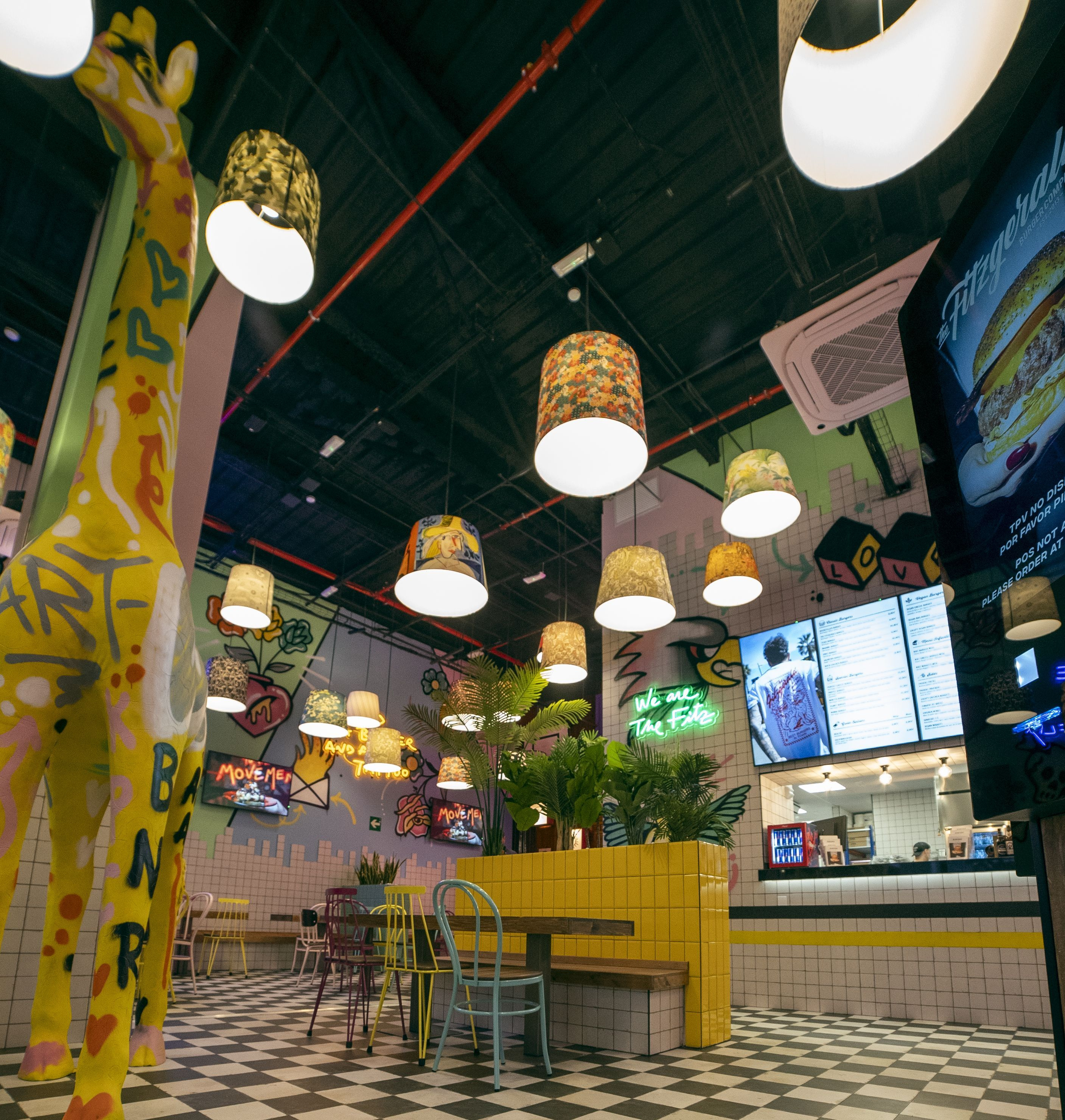 La nueva hamburguesería de The Fitzgerald se encuentra situada en la Calle Jade, 2. El espacio elegido para esta apertura, como cada uno de los establecimientos de The Fitzgerald, ha sido minuciosamente escogido. Se trata de un amplio local con una gran terraza, donde disfrutar de una decoración repleta de luces de neón y grafitis en sus paredes y dos innovadores kioscos de autopedido. Como protagonista, presidiendo el local, una enorme jirafa.