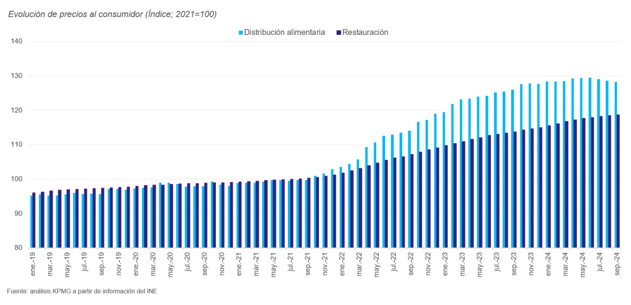 A este respecto, Juan Rojas Osuna, Senior Manager Consumo y Retail en KPMG España, recuerda en su LinkedIn que ya van siete meses consecutivos en los que los precios de la restauración suben más que los de la distribución alimentaria (+4,4% vs +1,8% en septiembre).