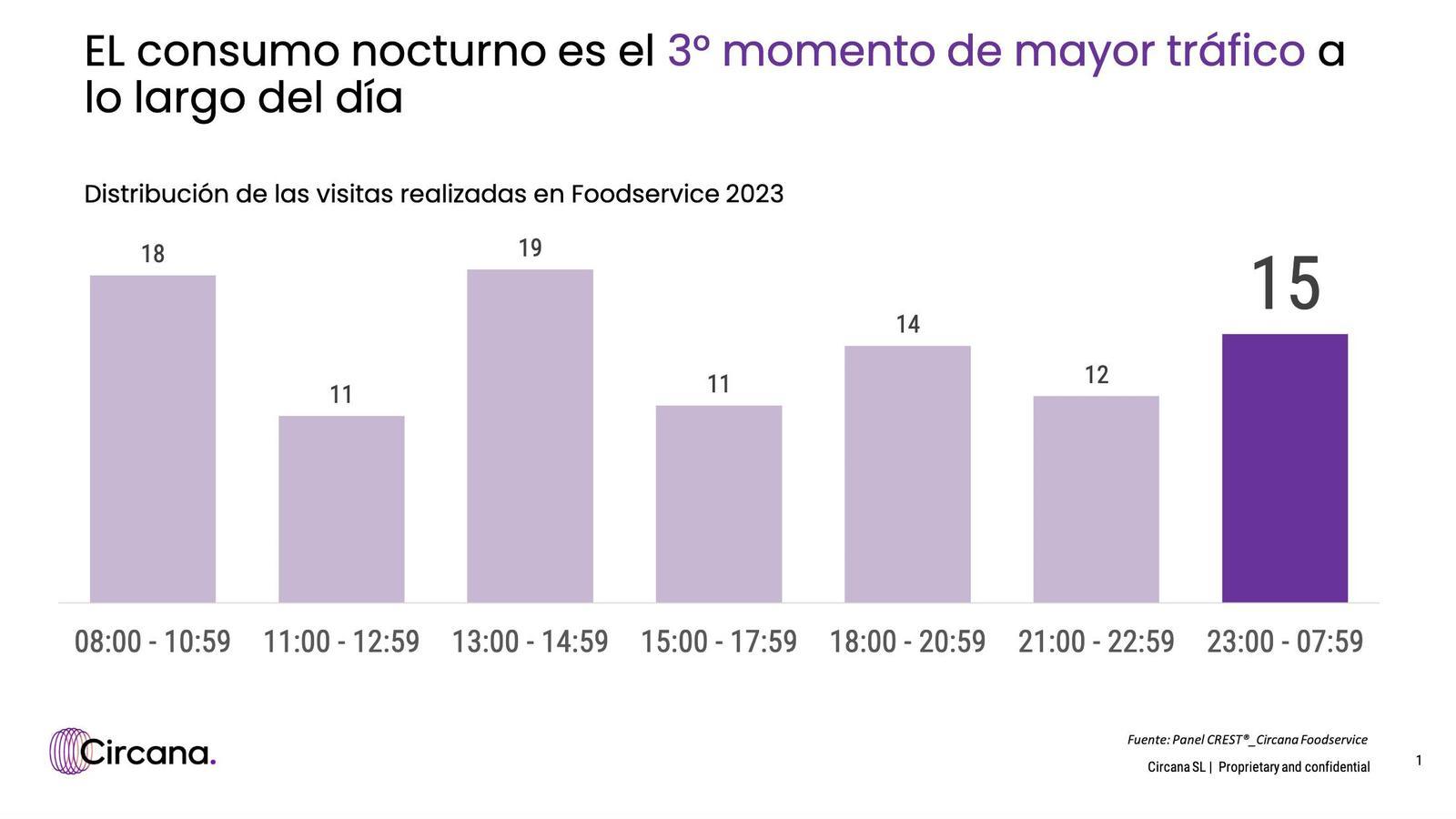 La cultura gastronómica española se distingue por sus hábitos de consumo particulares y flexibles, en particular durante las horas de la noche. "El 15% de las visitas a establecimientos de comida y bebida se realiza entre las 23h y las 8h del día siguiente", señala el informe Panel Crest de Circana.