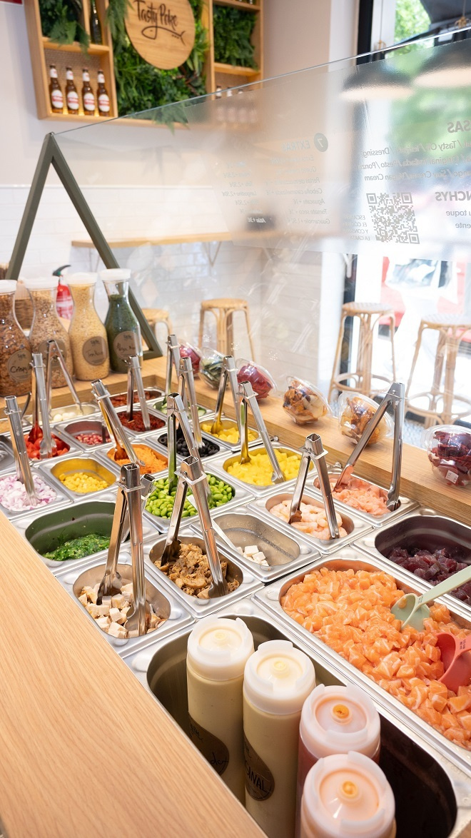 La oferta gastronómica de Tasty Poke incluye pokes de pescado, pollo, tofu o Heura con bases de arroz, quinoa o lechuga y toppings ilimitados, desde alga wakame a salsas especiales, así como postres y zumos elaborados con ingredientes frescos.