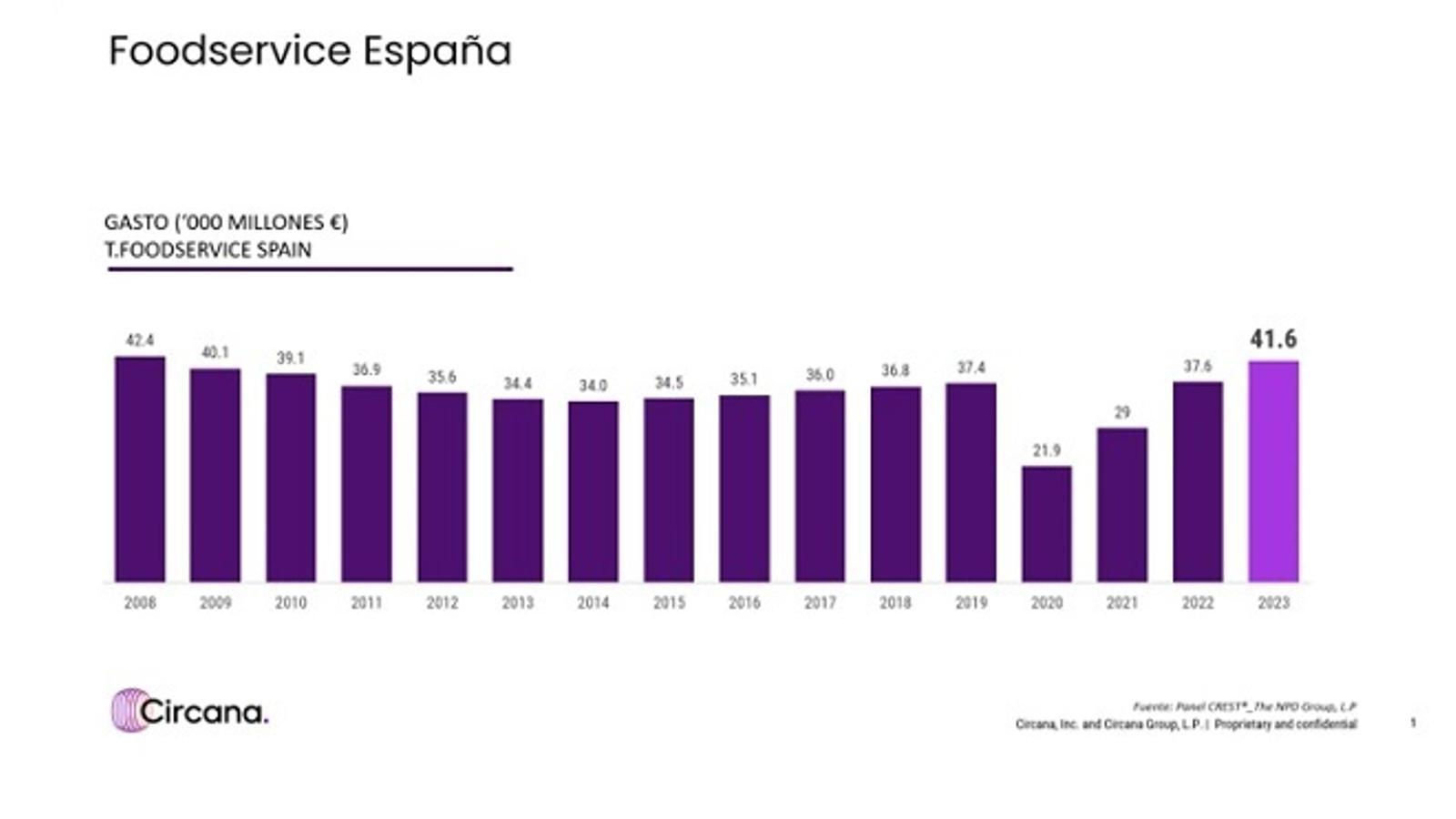 El año 2023 que acaba de concluir ha sido el mejor año para el foodservice de entre los últimos 15 años en España: cerca de 7.210 millones de ocasiones de consumo en el sector y unas ventas que superan los 41.650 millones de euros, lo que supone un fuerte crecimiento respecto al ejercicio anterior, del +3,2% y +11%, respectivamente.