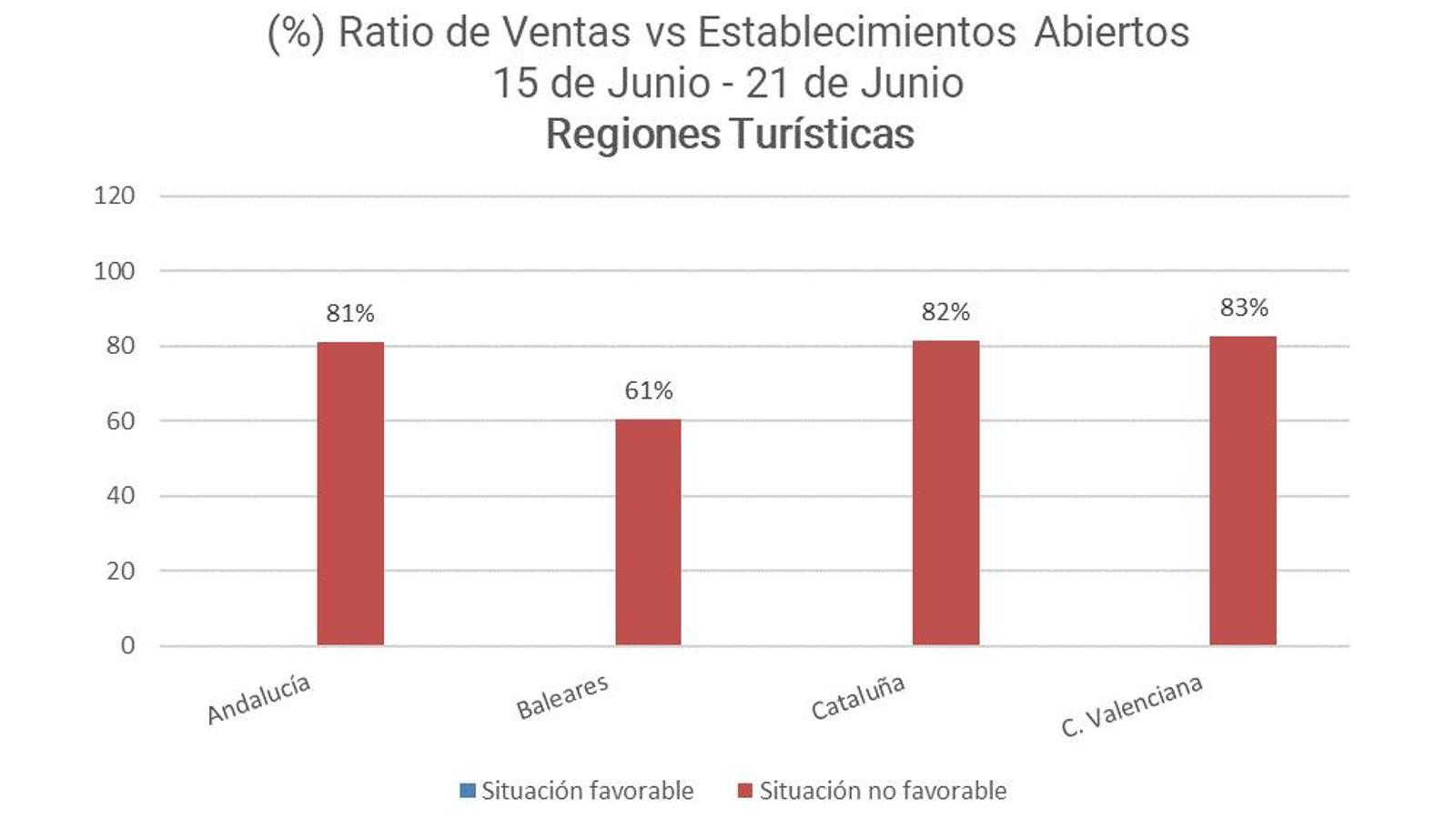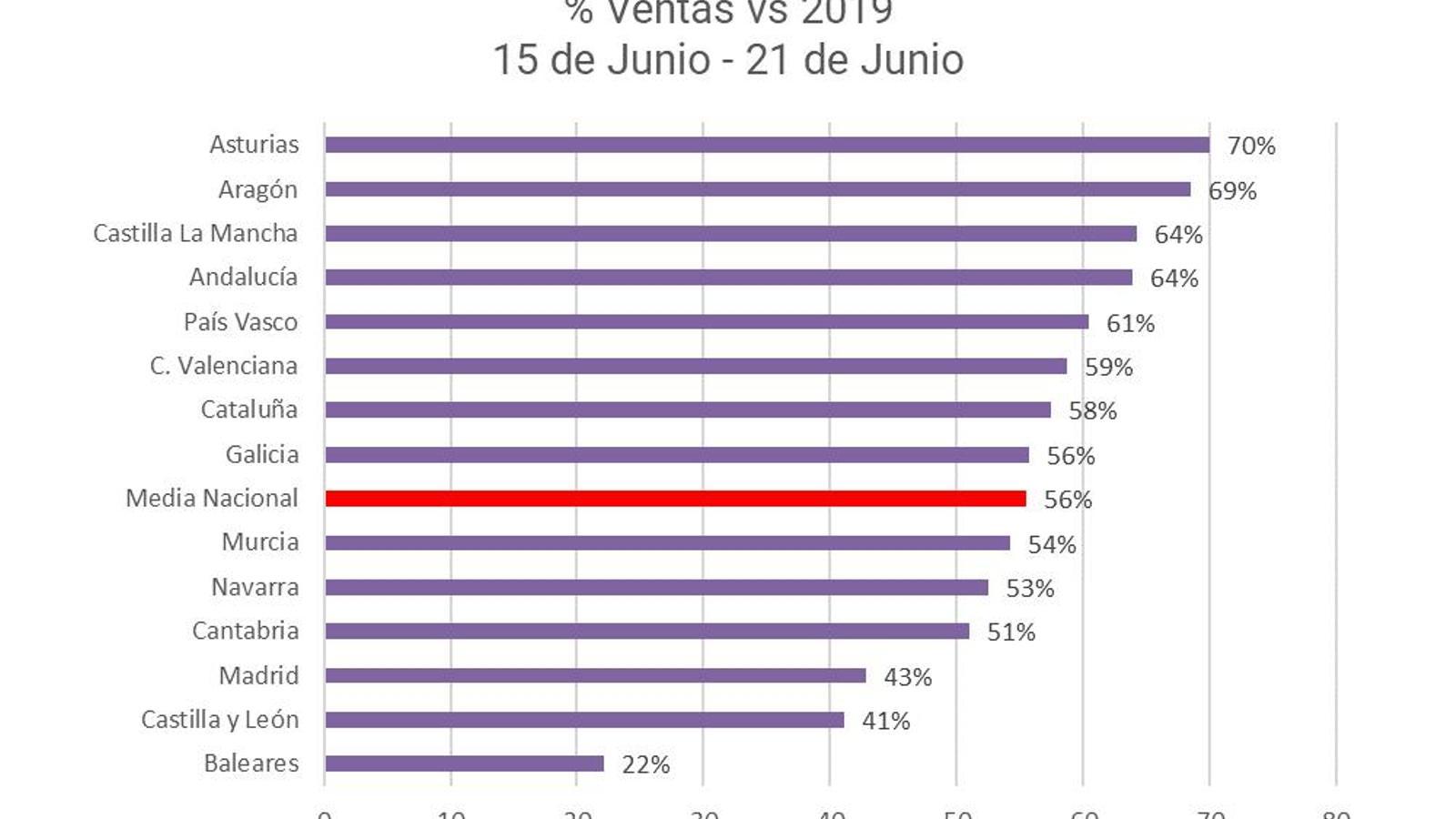 En cuanto a ventas, la situación es especialmente dramática en Baleares, con el 22% de las ventas del año anterior. Menos impactados, los negocios de Asturias y Aragón llevan el 70% y 69% respectivamente de las ventas (vs 2019).