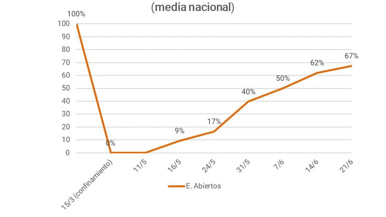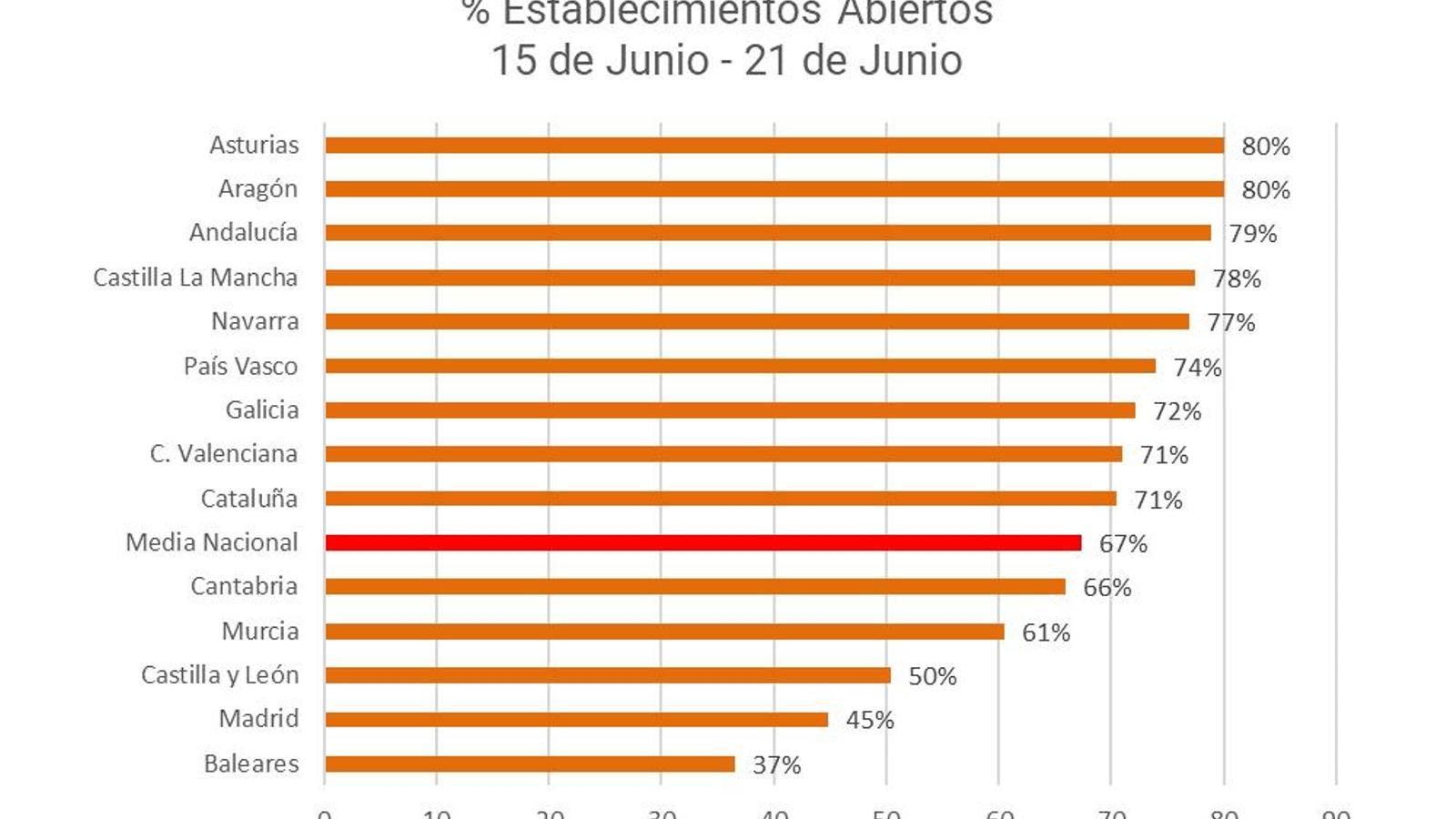 Han crecido en aperturas las comunidades que estaban más atrasadas en la desescalada, pero se mantienen muy por debajo de la media Baleares (37%), Madrid (45%) y Castilla y León (50%).